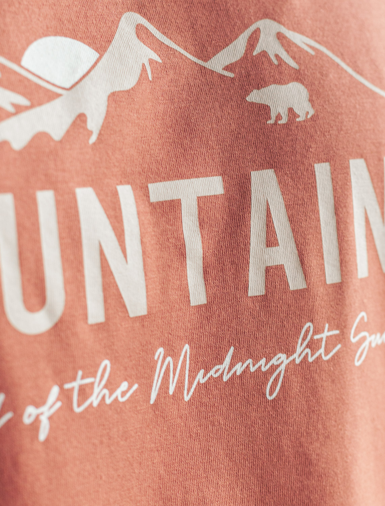 Перевод принта: Mountains, land of the midnight sun - горы - страна полуночного солнца. Футболка выполнена из премиального хлопка с эластаном. Авторский принт нанесен фактурными красками с устойчивым покрытием. Изделие комфортно сидит по фигуре, не сковывая движений. За счет среднего объема, хорошо подойдет как первый слой под пиджак, кардиган или бомбер. На рукаве нашивка из эко-кожи с логотипом бренда.