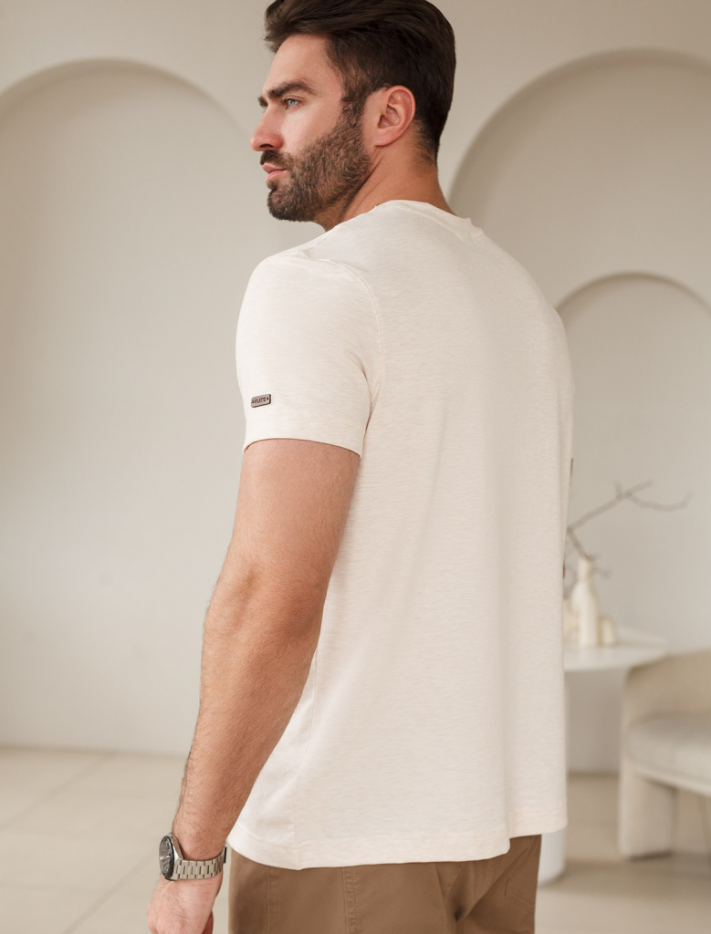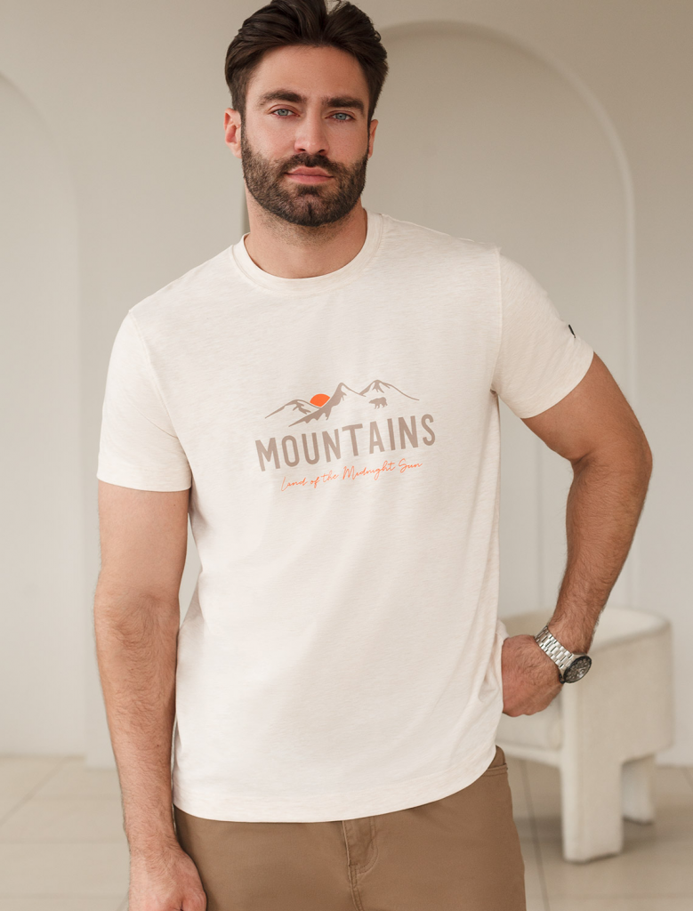 Футболка выполнена из премиального хлопка с эластаном. Авторский принт нанесен фактурными красками с устойчивым покрытием. Изделие комфортно сидит по фигуре, не сковывая движений. За счет среднего объема, хорошо подойдет как первый слой под пиджак, кардиган или бомбер. На рукаве нашивка из эко-кожи с логотипом бренда.
