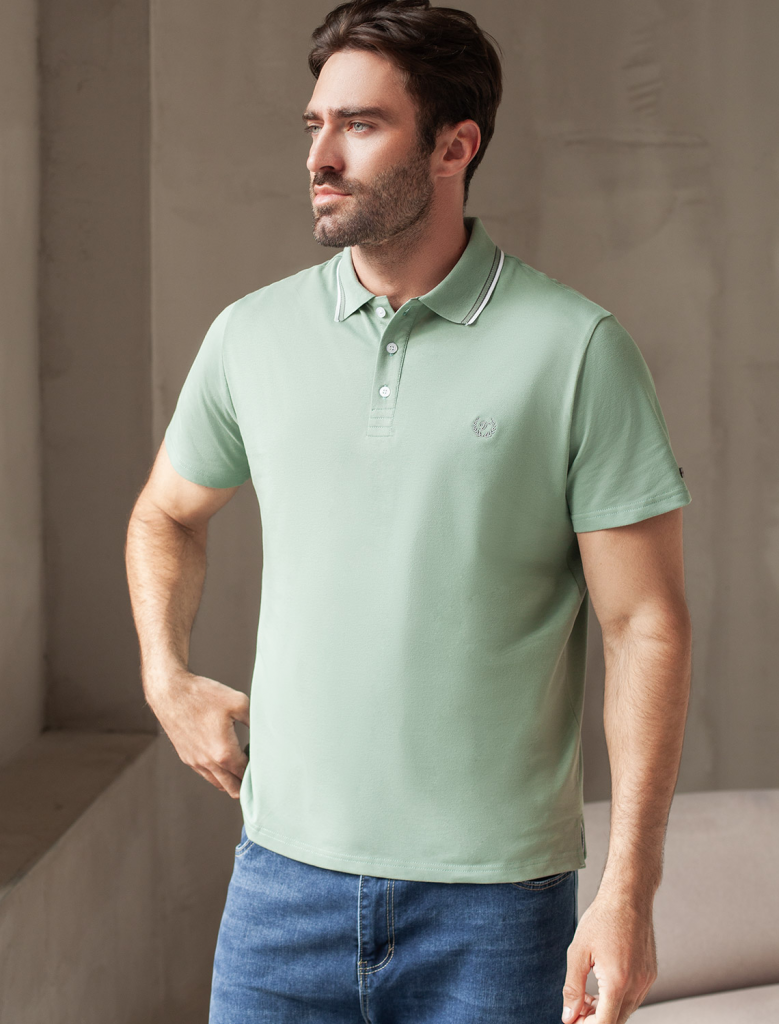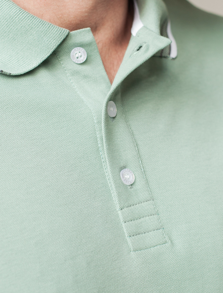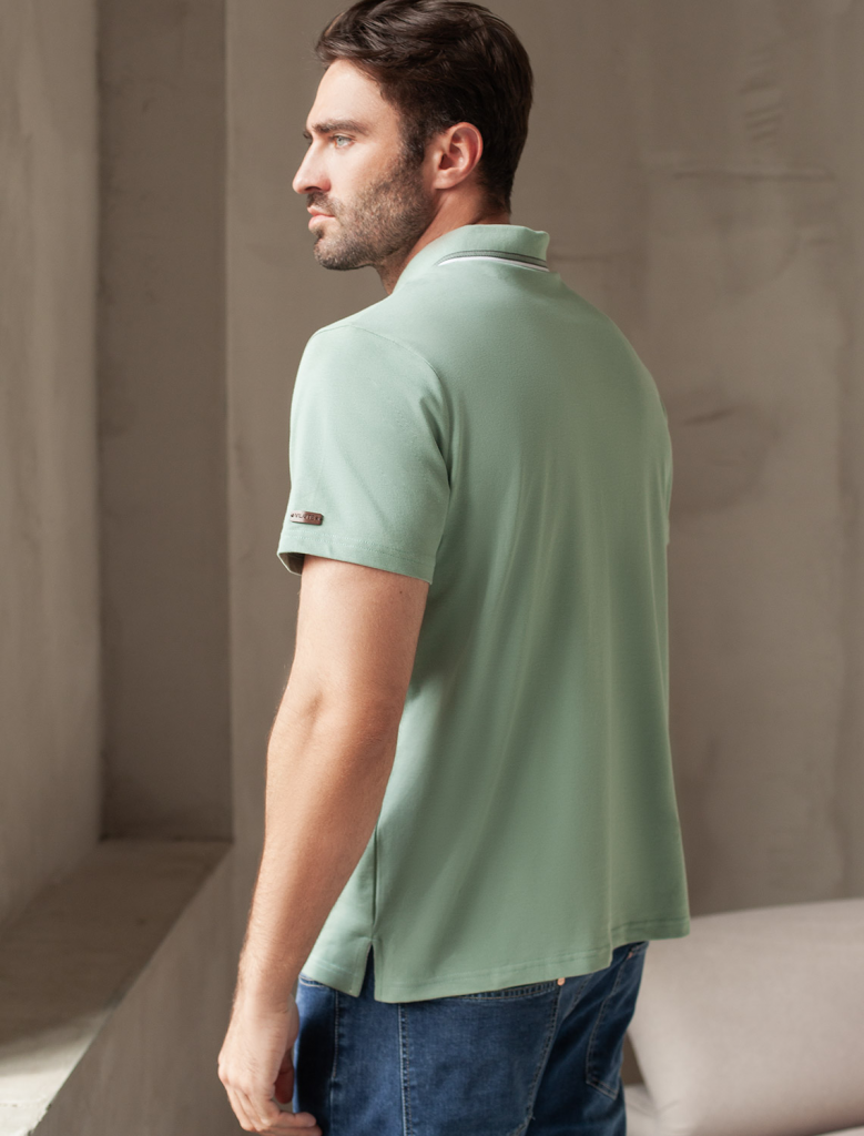 Футболка-поло выполнена из фактурного трикотажа. Модель с прямого кроя с небольшими разрезами по бокам дополнена вязаным воротником с контрастными пуговицами в тон тонкой полосы и вышитым логотипом бренда. Премиальный хлопковый трикотаж гарантирует комфорт и износостойкость. На рукаве брендированная нашивка из эко-кожи.