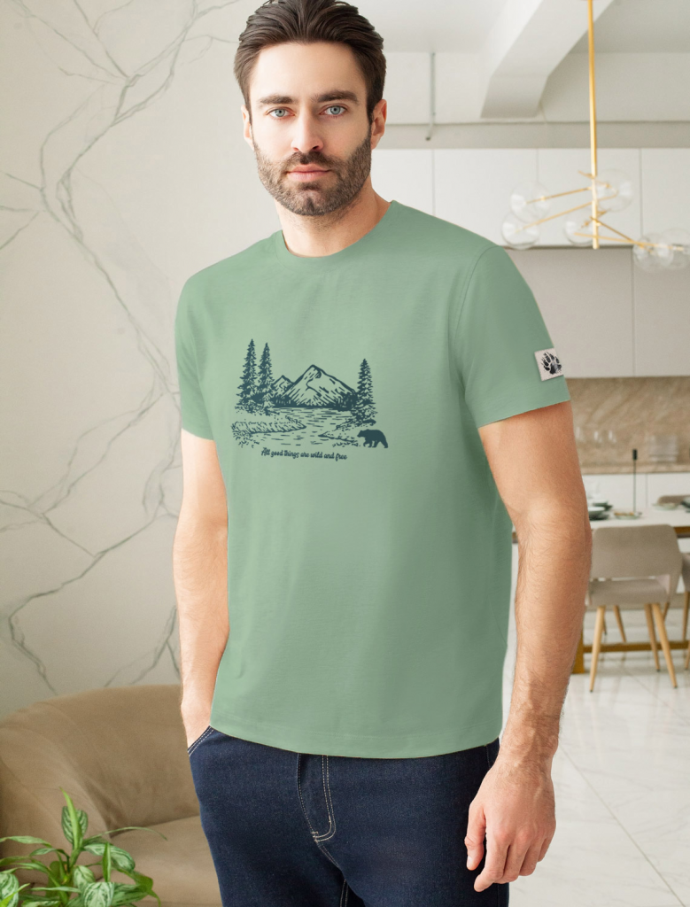 Перевод принта: All good things are wild and free - все лучшее ждет в диких местах. Футболка выполнена из премиального хлопка с эластаном. Авторский принт нанесен фактурными красками с устойчивым покрытием. Изделие комфортно сидит по фигуре, не сковывая движений. За счет среднего объема, хорошо подойдет как первый слой под пиджак, кардиган или бомбер. На рукаве нашивка из эко-кожи с логотипом бренда.