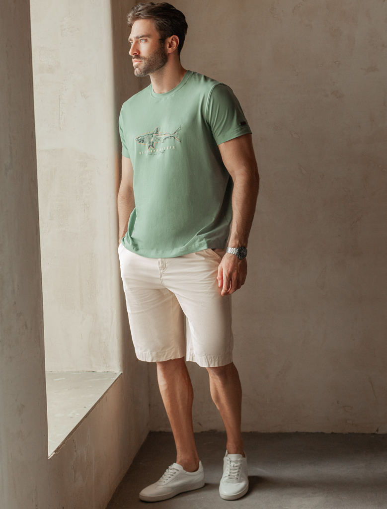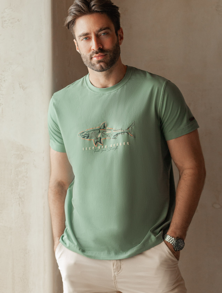 Перевод принта: deep and hungry, feed your strength - голодный обитатель глубин, укрепляй свою силу. Футболка выполнена из премиального хлопка с эластаном. Авторский принт нанесен фактурными красками с устойчивым покрытием. Изделие комфортно сидит по фигуре, не сковывая движений. За счет среднего объема, хорошо подойдет как первый слой под пиджак, кардиган или бомбер. На рукаве нашивка из эко-кожи с логотипом бренда.