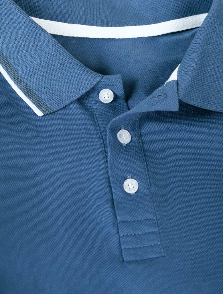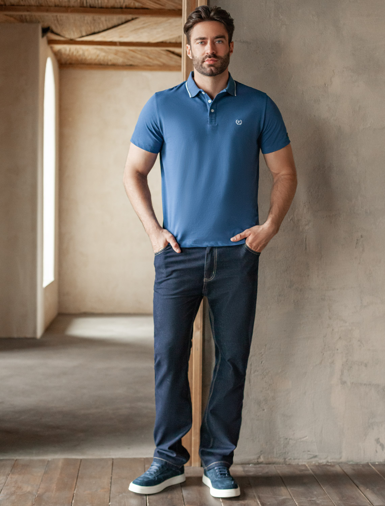 Футболка-поло выполнена из фактурного трикотажа. Модель с прямого кроя с небольшими разрезами по бокам дополнена вязаным воротником с контрастными пуговицами в тон тонкой полосы и вышитым логотипом бренда. Премиальный хлопковый трикотаж гарантирует комфорт и износостойкость. На рукаве брендированная нашивка из эко-кожи.