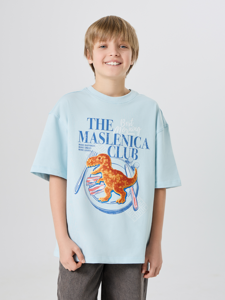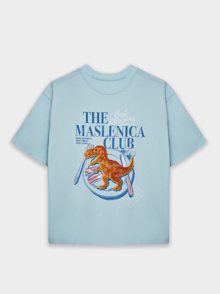 Футболка нежного голубого оттенка с надписью «Клуб Масленицы. Больше счастья. Больше улыбок. Больше добра». Это тематическая вещь, которая передаёт душевную атмосферу народного праздника — тёплого, щедрого и объединяющего, напоминая о простых радостях и общем веселье.