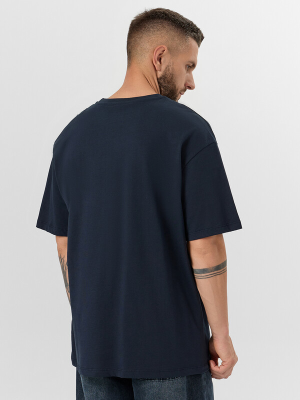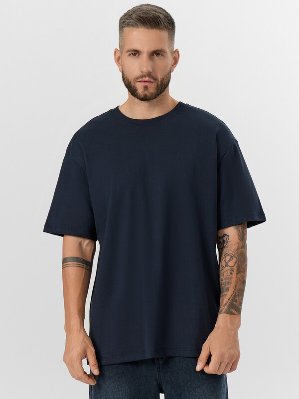 Футболка свободного силуэта. Перед и спинка цельнокроеные. Горловина круглой формы. Обтачка горловины из рибаны 1*1. По горловине проложена отделочная строчка. Горловина спинки закрыта тесьмой из основного полотна. Плечо спущено, пройма углублена. Рукав втачной, длина рукава чуть выше локтя.