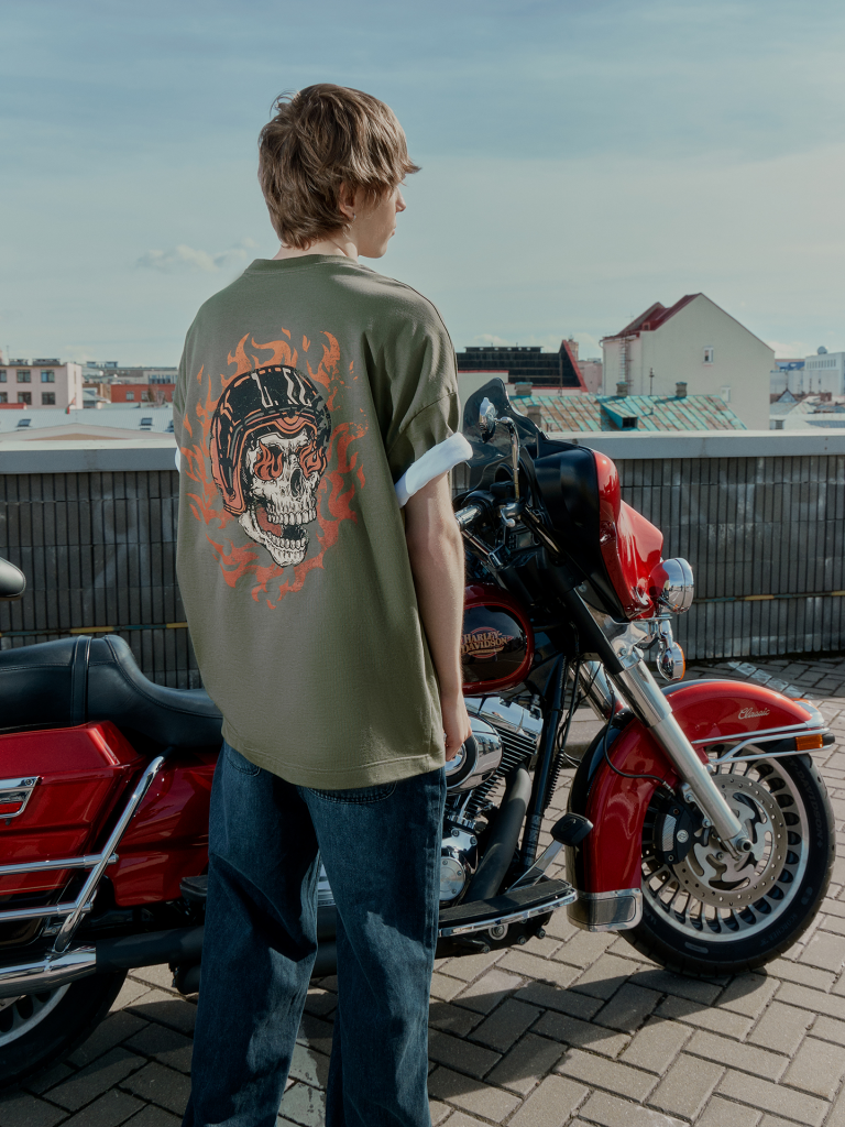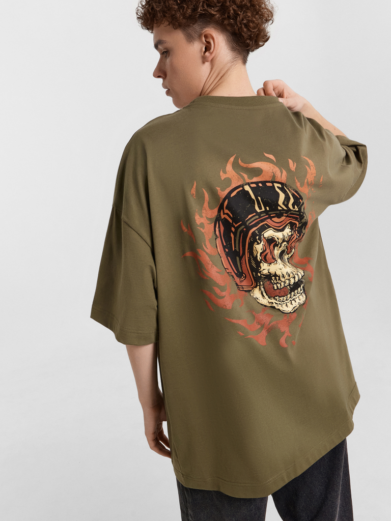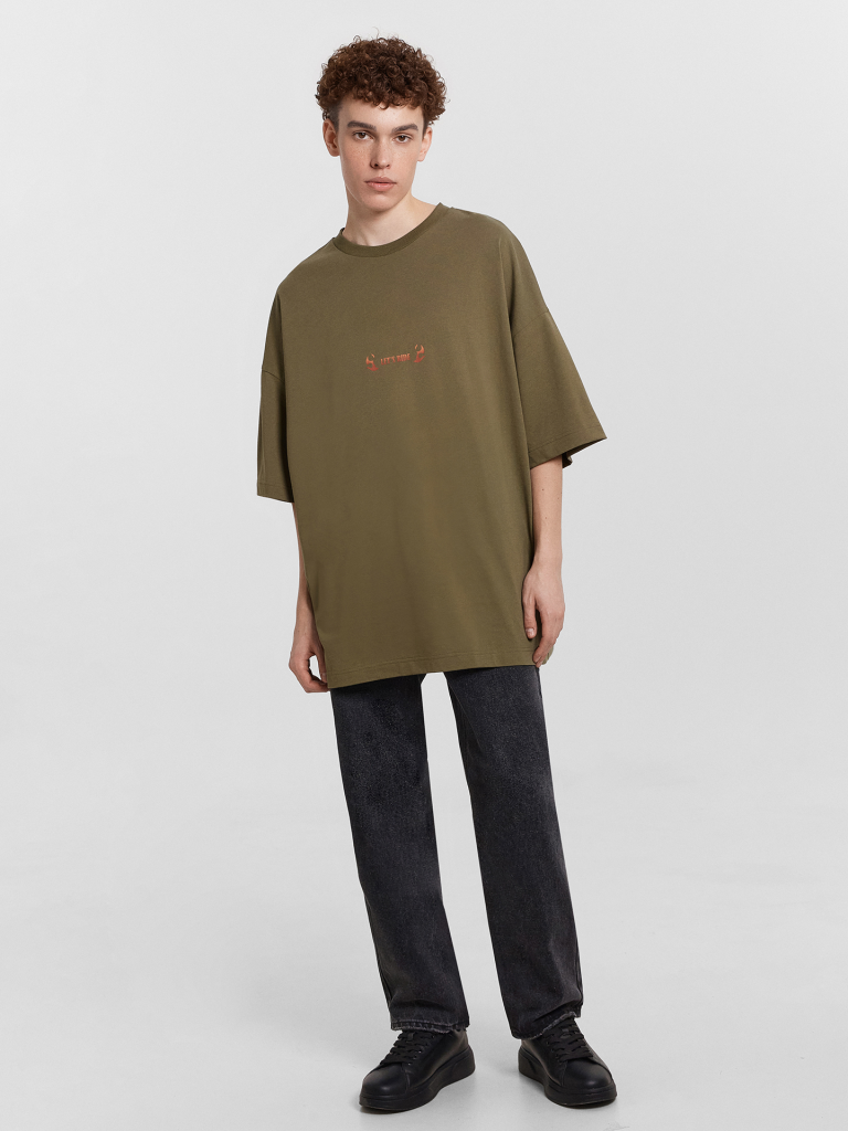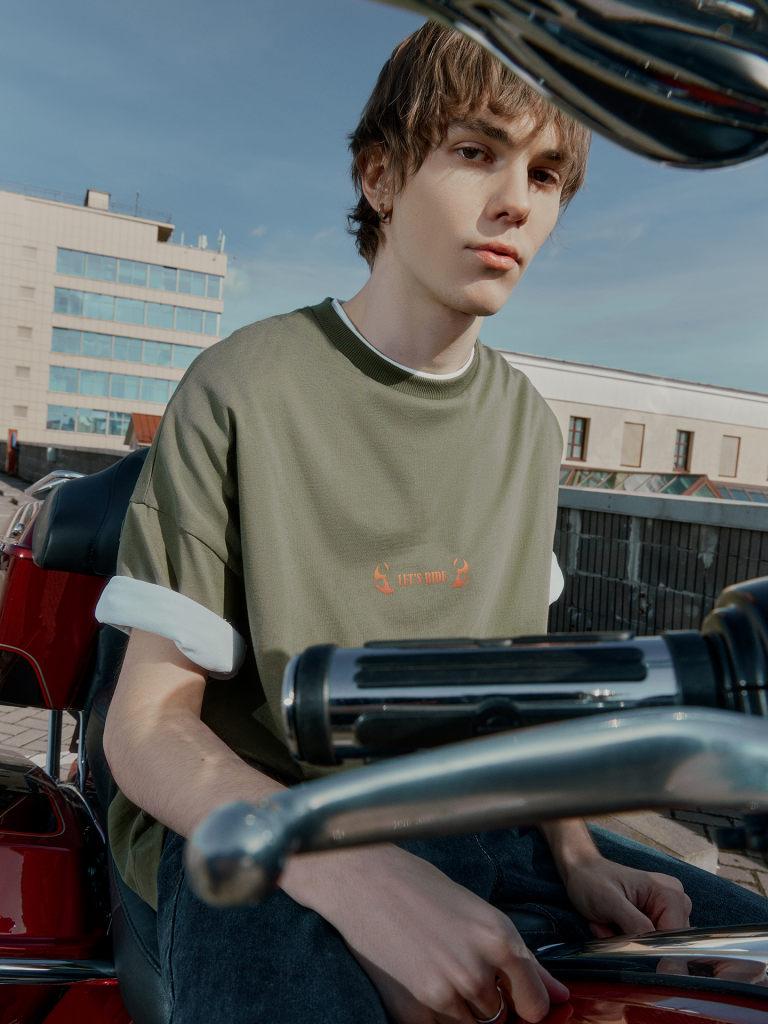 Нижние срезы футболки и рукавов обработаны швом вподгибку.