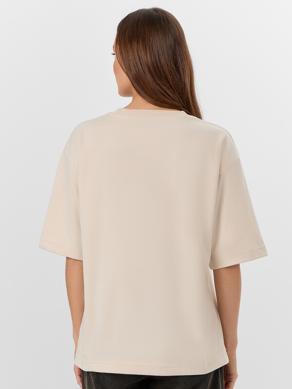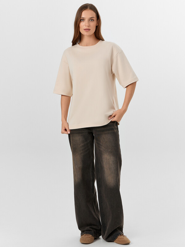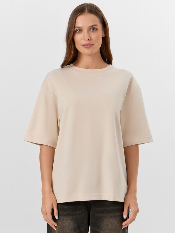 Бежевая футболка свободного кроя — главный помощник для стильных повседневных образов. Модель с мягкой округлой горловиной и спущенной линией плеча создает ощущение уютной расслабленности. Главное преимущество — сбалансированный состав хлопка и полиэстера, благодаря которому ткань интерлок сохраняет лучшие качества натурального материала: она приятна к телу, позволяет коже дышать и обеспечивает комфортную температуру. При этом полиэстер в составе добавляет ткани прочности — футболка не сядет после стирки, не растянется в плечах и надолго сохранит опрятный вид даже при активной носке.