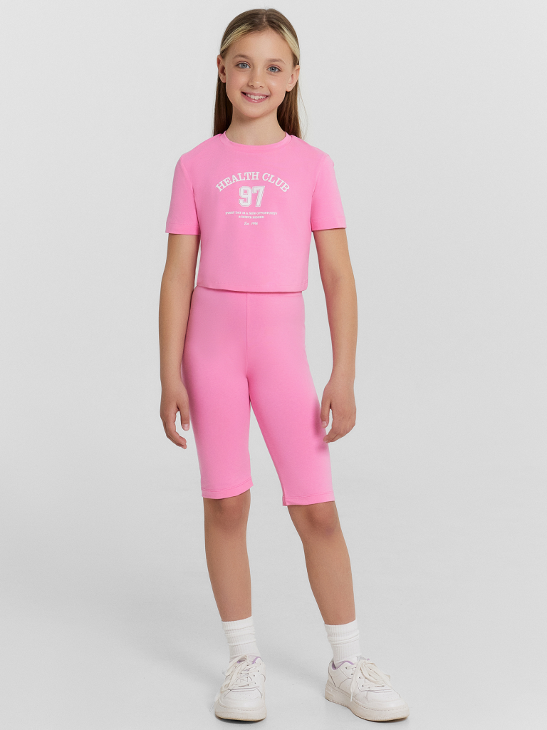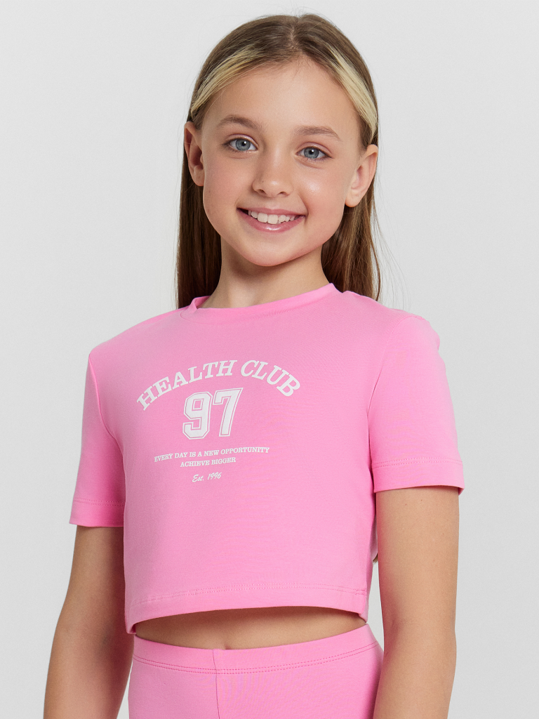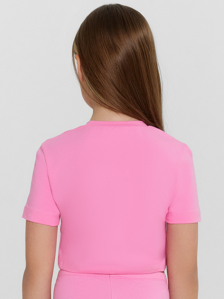 Футболка прилегающего силуэта, укороченна. Перед и спинка цельнокроенные. Рукав втачной, короткий. Горловина круглой формы. Обработана обтачкой из основного полотна. Низ рукавов и футболки швом в подгибку.