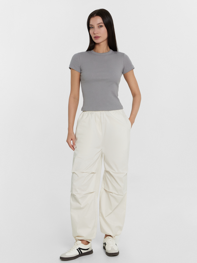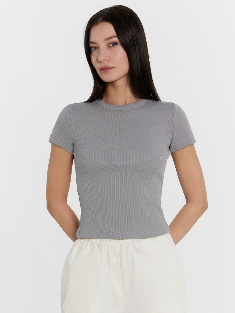 Джемпер прилегающего силуэта. Горловина круглой формы обработана бейкой в 4 сложения из основного полотна. Рукава втачные, короткие. Нижние срезы джемпера и рукавов обработаны швом вподгибку.