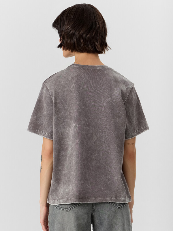 втачивания обтачки по горловине спинки закрыт бейкой из основного полотна. Рукава втачные короткие. Нижние срезы джемпера и рукавов обработаны швом вподгибку.