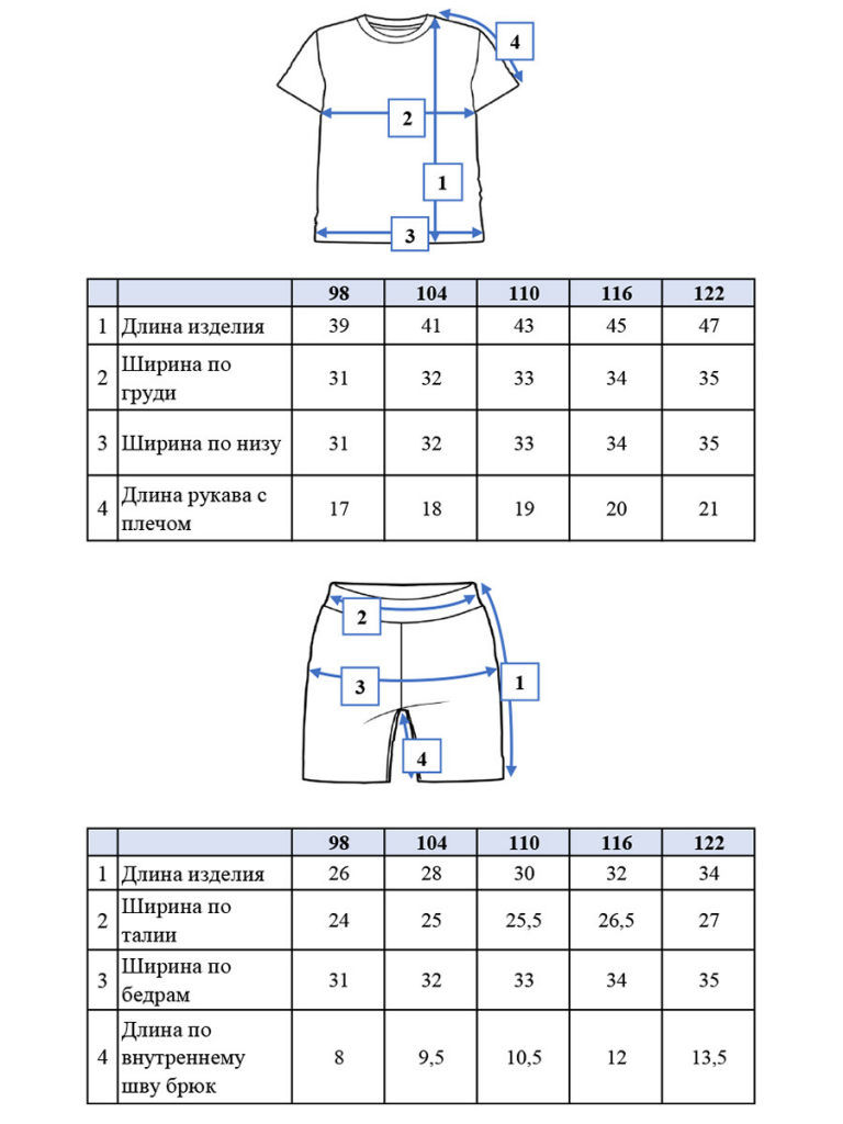 Комплект футболка и шорты из качественного эластичного и приятного на ощупь трикотажа. Эластичный пояс с кулиской позволяет легко надевать брюки и утягивать до комфортной посадки в зависимости от комплекции ребенка. Функциональные карманы.