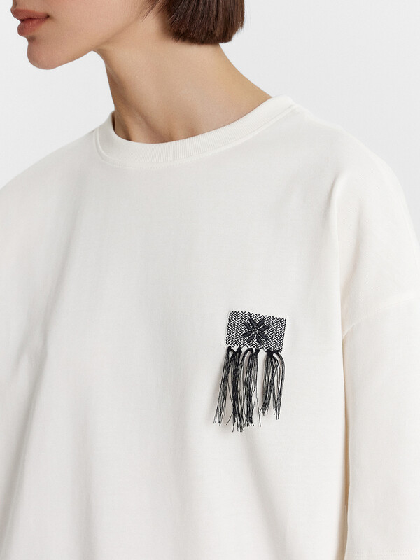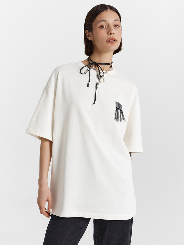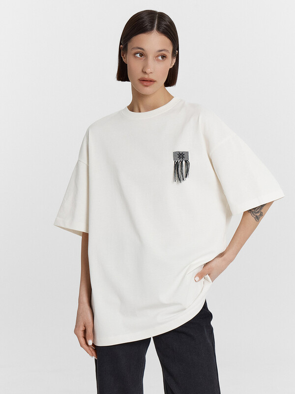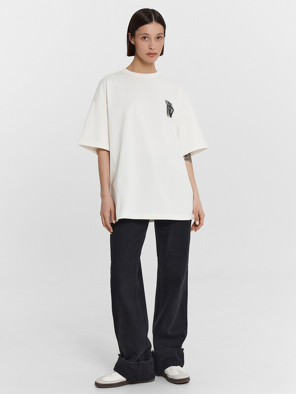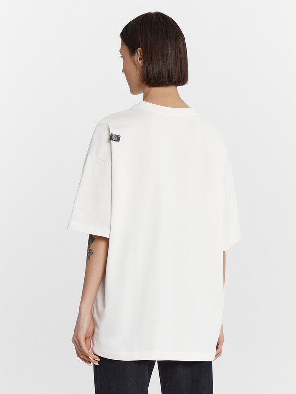 Эта женская удлиненная футболка оверсайз — стильное и комфортное решение для современного гардероба. Свободный силуэт дарит ощущение расслабленности и удобства, подчеркивая актуальный тренд на объем и легкость в образе. Модель выполнена из хлопковой кулирки — мягкого, воздухопроницаемого материала, который приятно ощущается на коже и обеспечивает комфорт в течение всего дня. Круглая горловина оформлена обтачкой из рибаны, что придает дополнительную эластичность и делает посадку комфортной. Спущенная линия плеча и углубленная пройма добавляют непринужденности в образ, создавая актуальный и расслабленный акцент. Широкие рукава длиной чуть выше локтя обеспечивают свободу движений и гармонично дополняют силуэт, делая модель идеальной для повседневного стиля. Эта футболка прекрасно сочетается с легинсами, джинсами, спортивными брюками и шортами, позволяя создавать стильные и удобные образы для любого случая. Универсальная и комфортная — идеальный выбор для тех, кто ценит стиль, свободу и удобство в одежде!