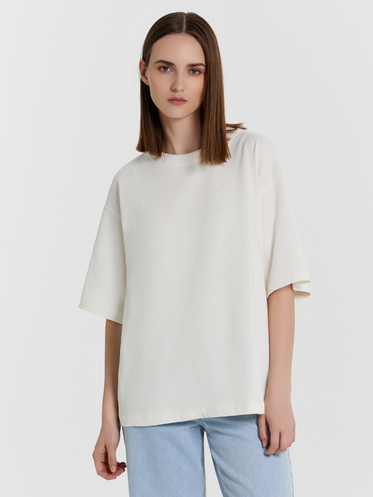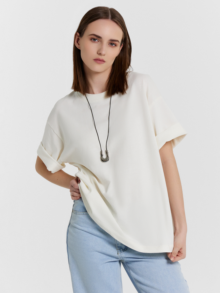 Женская футболка оверсайз станет отличным дополнением ваших стильных аутфитов. Изготовленная из высококачественной хлопковой кулирки, она обеспечивает комфорт и долговечность. Округлая горловина и короткие рукава создают классический и современный образ, а спущенная линия плеча добавляет непринужденности и свободного стиля. Модель легко сочетается с различными элементами гардероба, что позволяет создавать разнообразные стильные образы для любого случая. Преобразите свой гардероб с этой универсальной и стильной футболкой Mark Formelle.