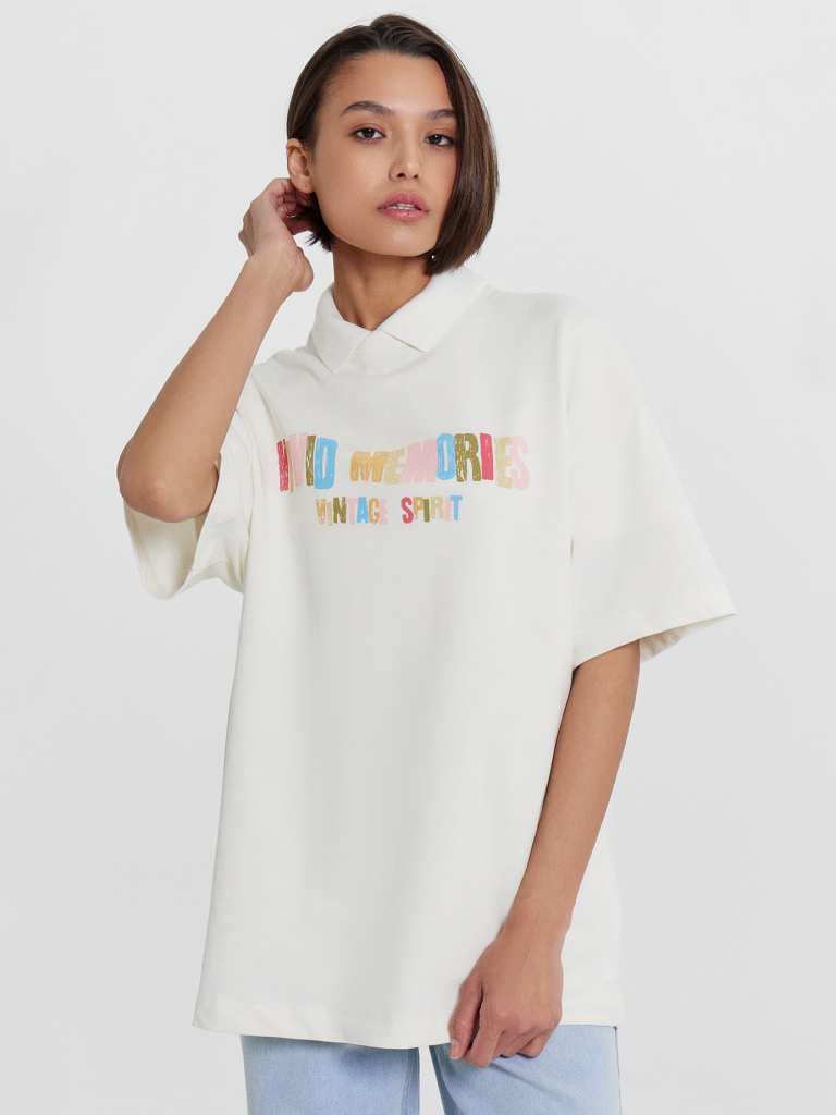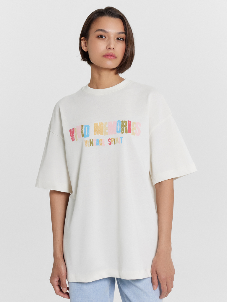 Женская футболка силуэта оверсайз выполнена из кулирки, что обеспечивает комфорт и легкость при носке. Модель имеет круглую горловину и спущенное плечо, создавая стильный и непринужденный образ. Пройма углублена, что добавляет дополнительного комфорта. Широкий рукав длиной чуть выше локтя и удлиненный силуэт придают футболке современный и модный вид. Эта модель идеально подходит для создания повседневных образов, легко сочетается с различными элементами гардероба и добавляет стильности и комфорта в повседневную одежду.