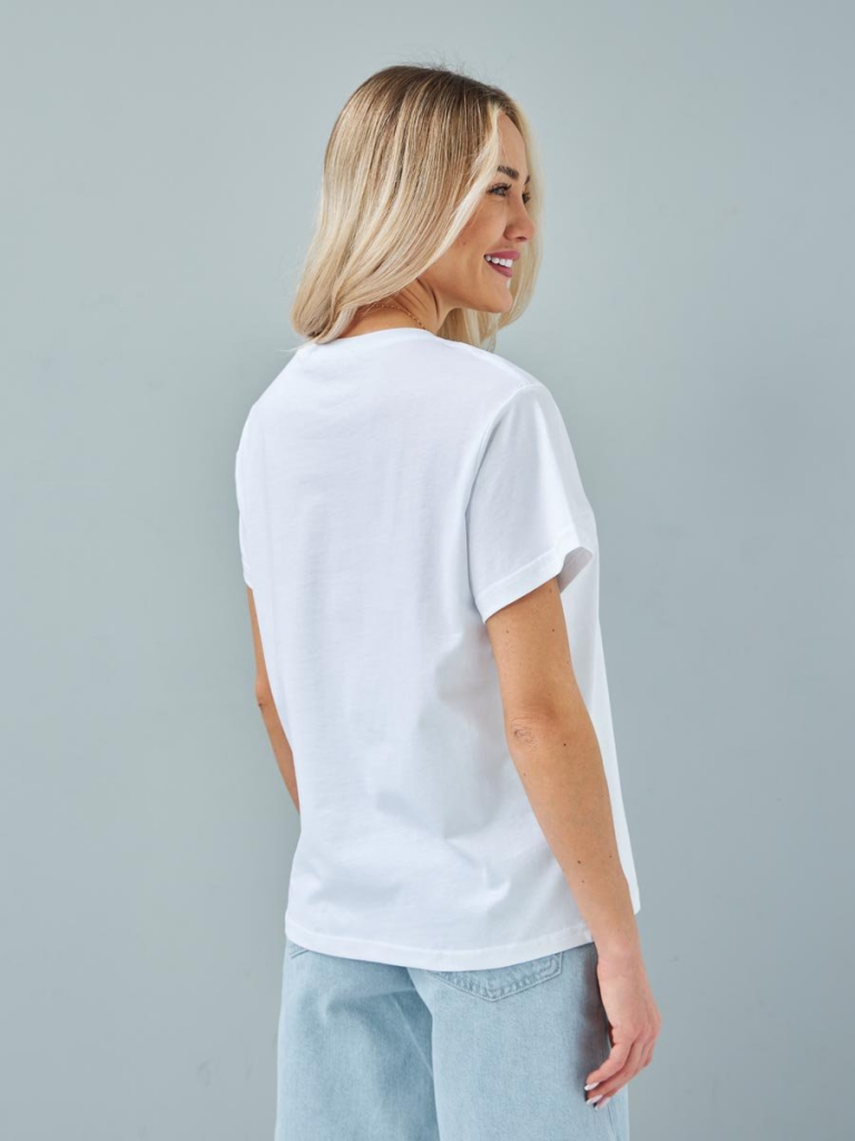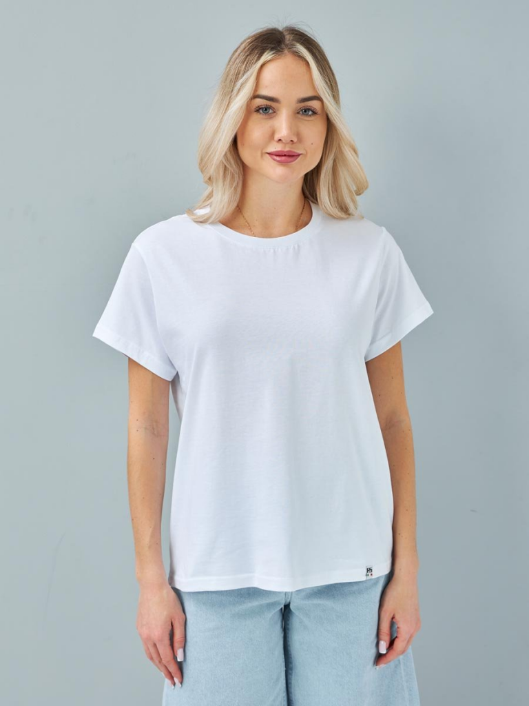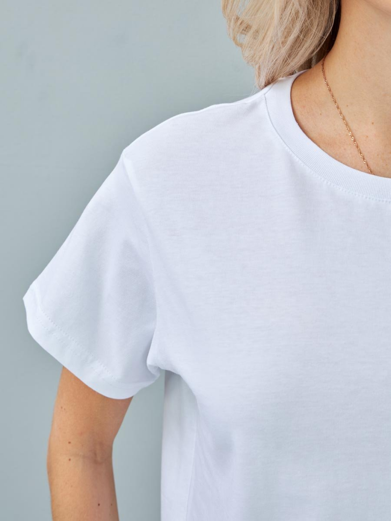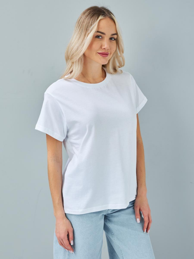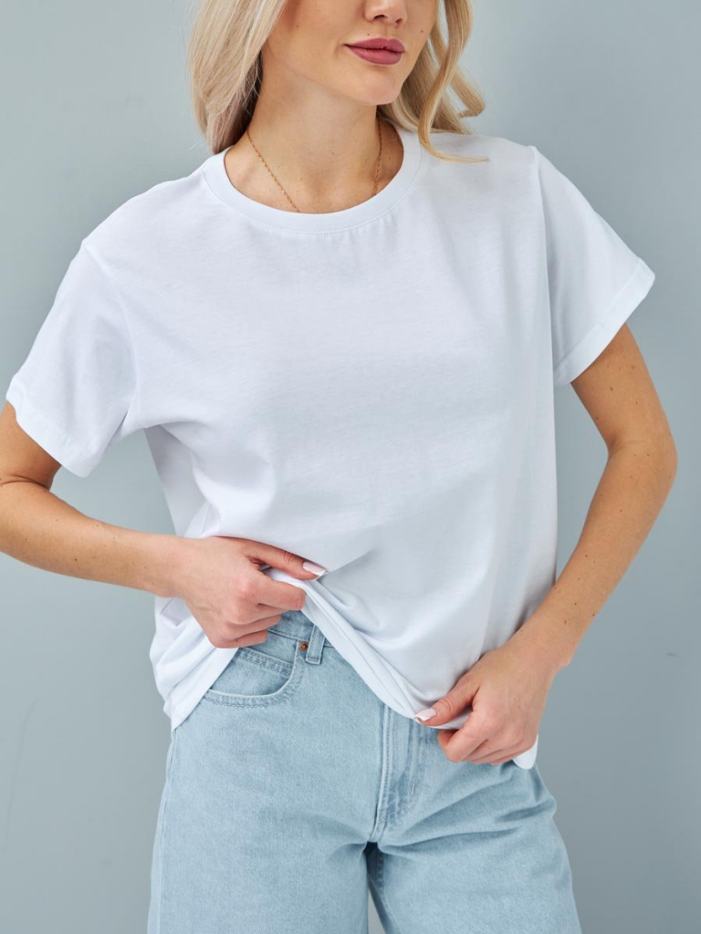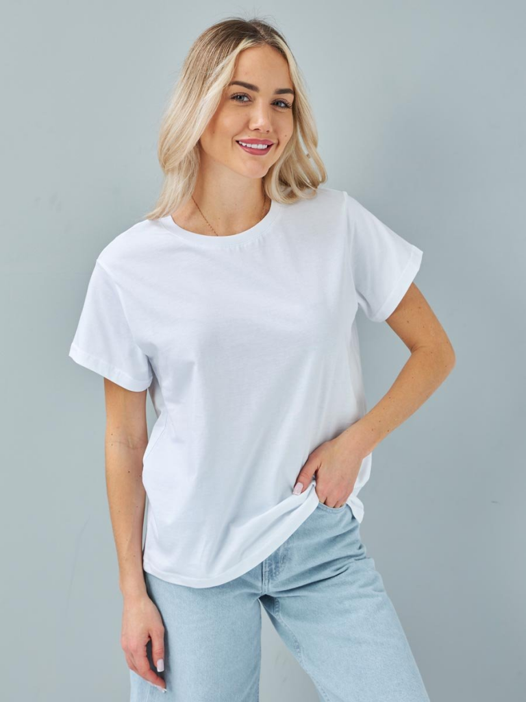 Женская футболка F5, Oversize fit (свободный силуэт), круглый вырез горловины, короткий цельнокроеный рукав. Выполнена из классического трикотажного полотна.