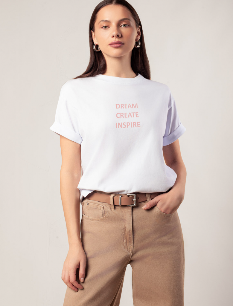 Перевод принта: Dream, create, inspire — мечтай, создавай, вдохновляй.Футболка из премиального хлопка, высокое качество хлопковых волокон обеспечивает комфорт в любое время года. Горловина выполнена из рибаны в тон изделия, Рукава с подворотами и золотистым логотипом бренда. Авторский принт нанесен фактурными красками с устойчивым покрытием. За счет эластана в составе идеально держит форму и сохраняет внешний вид в течение долговременного использования. Универсальная вещь для ваших стилистических решений.
