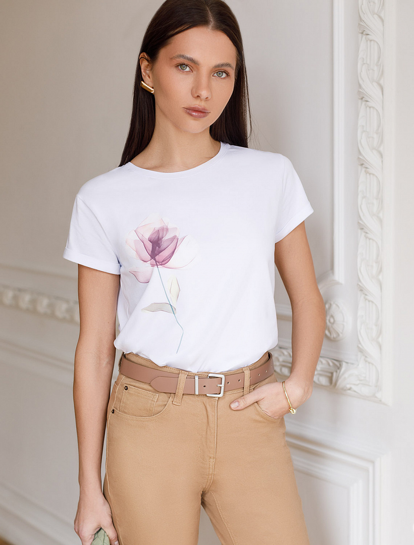Футболка выполнена из премиального хлопка с эластаном. Авторский принт нанесен красками с устойчивым покрытием. Модель среднего объема дополнена подворотами на рукавах. Легко впишется в повседневные аутфиты и добавит акцента в образы. Изделие дополнено металлическим логотипом бренда.