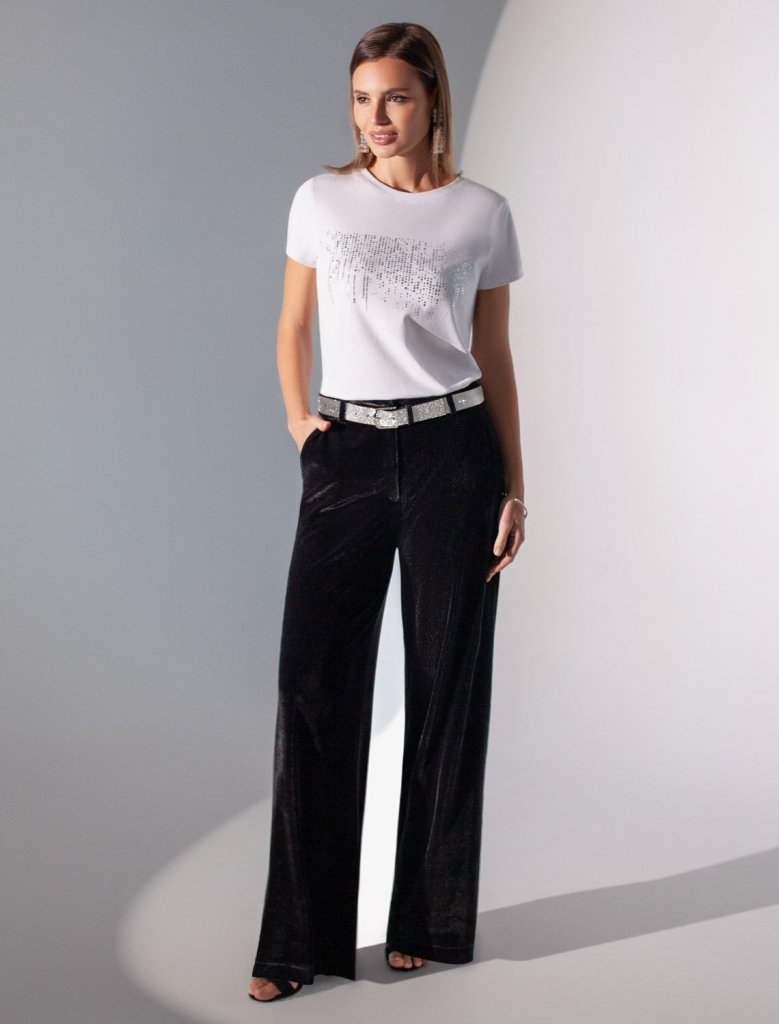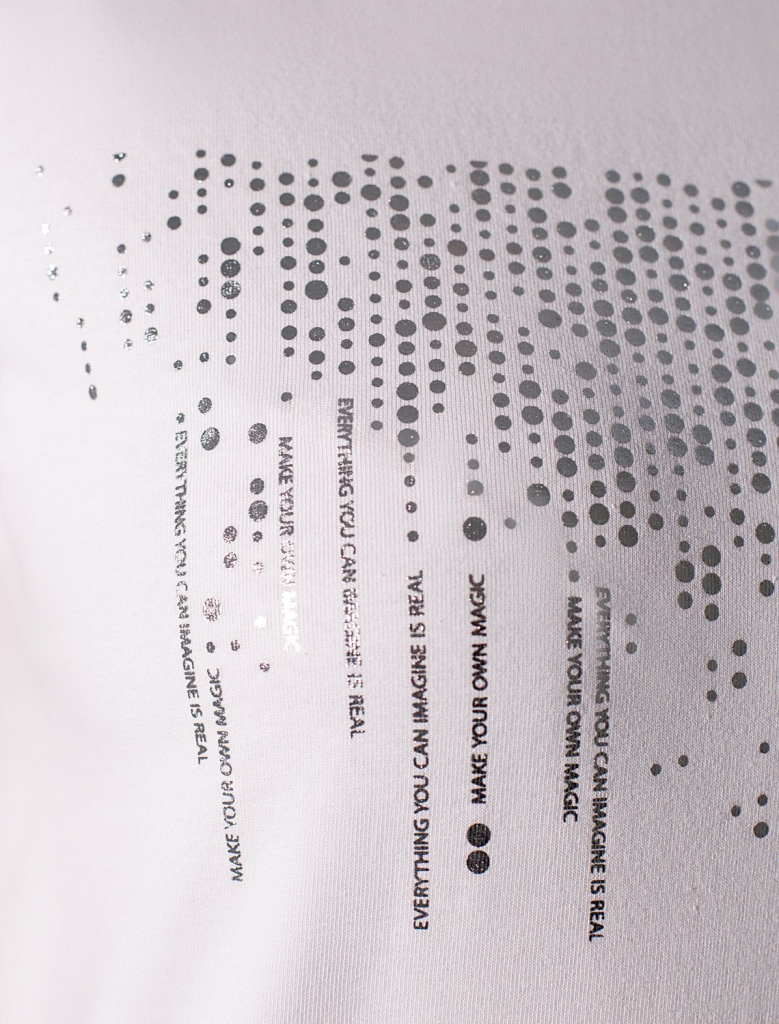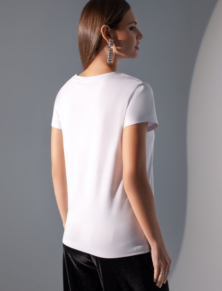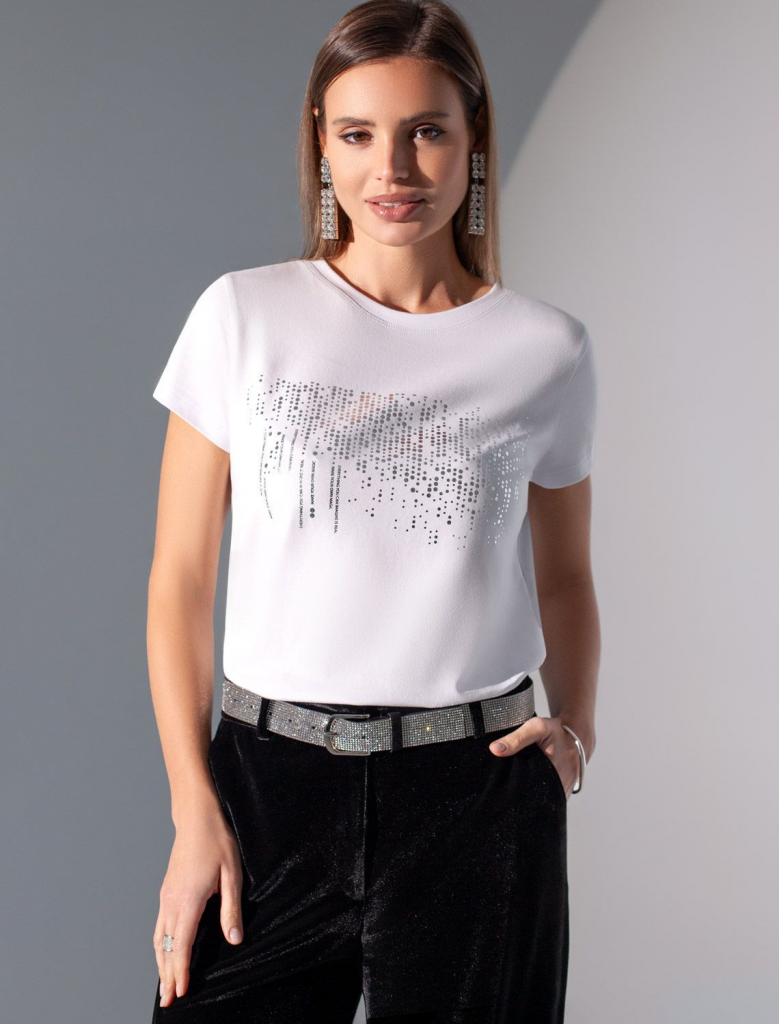 Стильная базовая футболка белого цвета с серебристым принтом стразами выполнена из плотного хлопка с эластаном для комфортной посадки на любую фигуру. Прямая футболка классического кроя с круглым вырезом, прекрасно подходит для разных типов фигуры, в том числе и на большие размеры. Мягкость хлопка вместе с небольшой долей эластана гарантирует идеальную посадку и свободу движений. Легкая натуральная дышащая ткань премиального качества делает футболку с коротким рукавом идеальным вариантом для повседневной носки дома, на работу или офис. Однотонная футболка дополнена авторским аккуратным принтом, который придает праздничный и элегантный вид без лишней вычурности. Блестящий принт в виде дождика из страз аккуратно украшает, добавляя изысканный акцент и создавая легкий мерцающий эффект. Эта эффектная футболка станет отличным выбором на праздник, подчеркивая образ сияющей и уверенной в себе девушки или женщины. Если вы ищете комфортный и одновременно привлекательный наряд для особых моментов, эта футболка стане