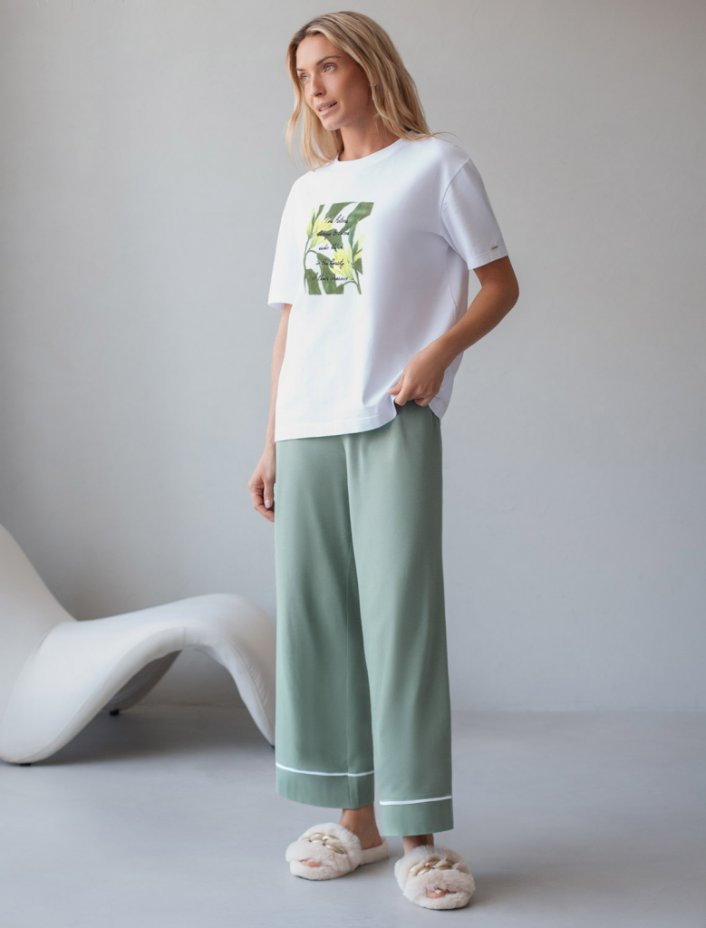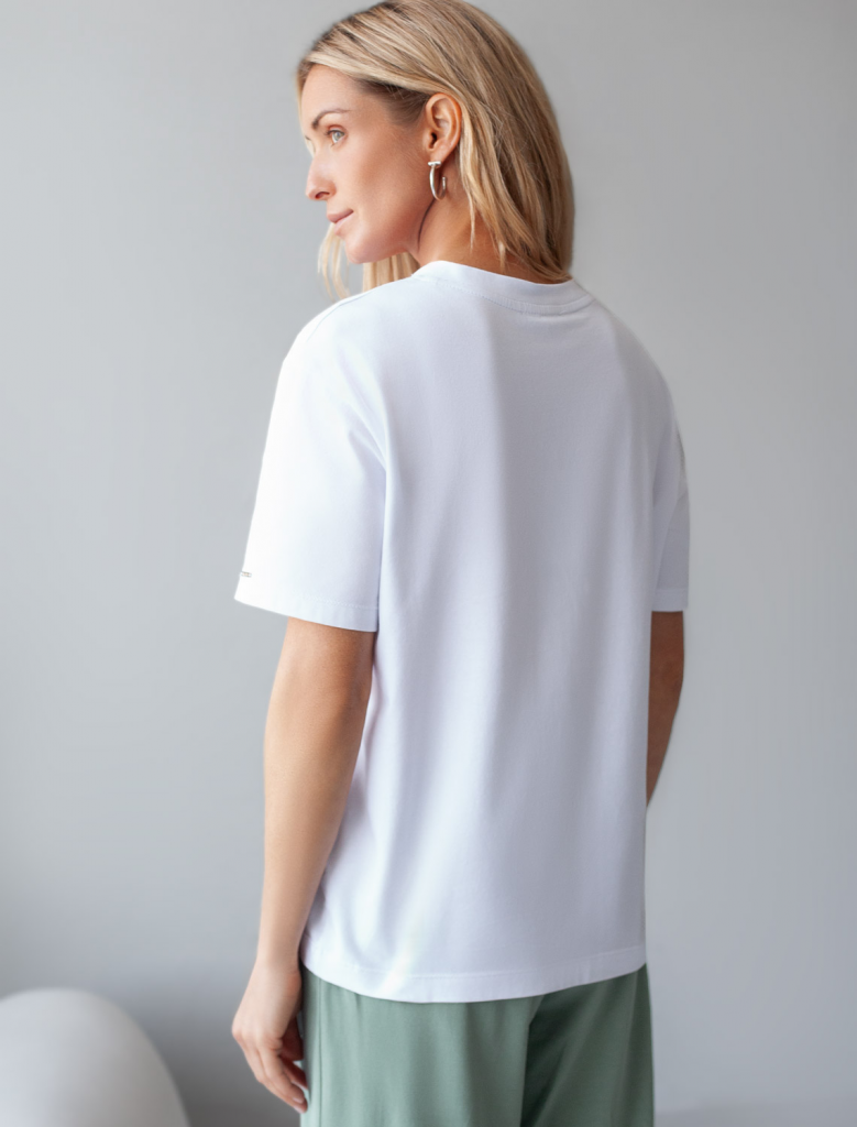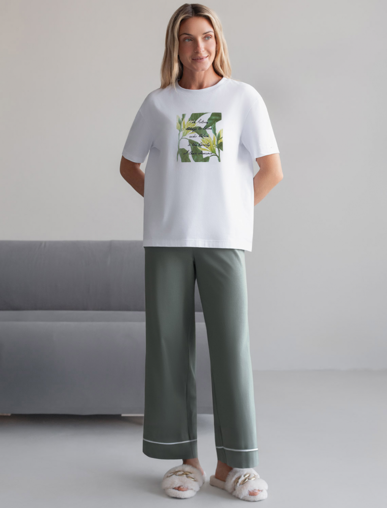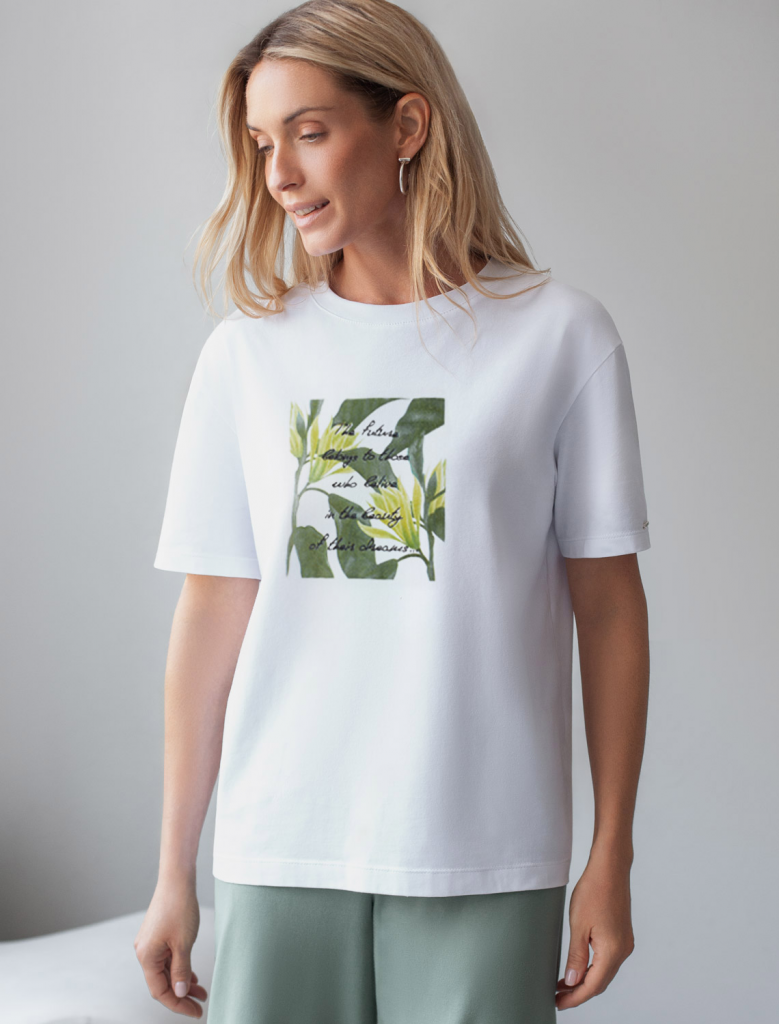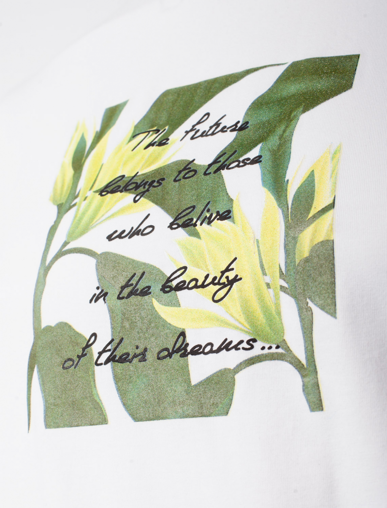 Футболка белого цвета изготовлена из премиального хлопка с эластаном, она обеспечивает невероятное ощущение уюта и легкости. Натуральный материал сохраняет форму и цвет после множества стирок, обеспечивая долговечность изделия, а его высокая воздухопроницаемость создает ощущение свежести даже в течение долгого дня. Особое внимание привлекает стильный принт в виде листьев и цветов с надписью, выполненный красками с устойчивым покрытием, который добавляет изделию оригинальности и позволяет выразить индивидуальность. Перевод надписи: The future belongs to those who believe in the beauty of their dreams - Будущее принадлежит тем, кто верит в красоту своей мечты.Свободный крой футболки дарит удобство и не стесняет движений, что делает ее идеальной для повседневной носки или активного отдыха, подчеркивает современный взгляд на моду. На рукаве металлический логотип бренда. Подойдет девушкам и женщинам на любую фигуру, вы будете чувствовать себя в ней уверенно и комфортно. Отлично впишется в гардероб благодаря ун