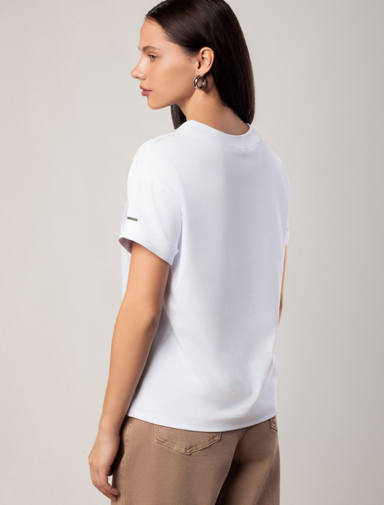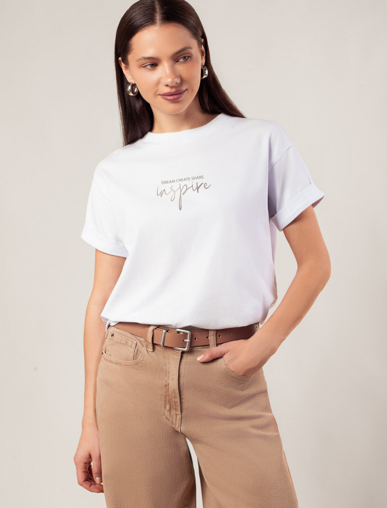 Перевод принта: Dream, create, share, inspire — мечтай, создавай, делись, вдохновляй.Футболка из премиального хлопка, высокое качество хлопковых волокон обеспечивает комфорт в любое время года. Горловина выполнена из рибаны в тон изделия, Рукава с подворотами и золотистым логотипом бренда. Авторский принт нанесен фактурными красками с устойчивым покрытием. За счет эластана в составе идеально держит форму и сохраняет внешний вид в течение долговременного использования. Универсальная вещь для ваших стилистических решений.