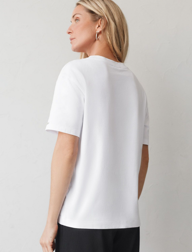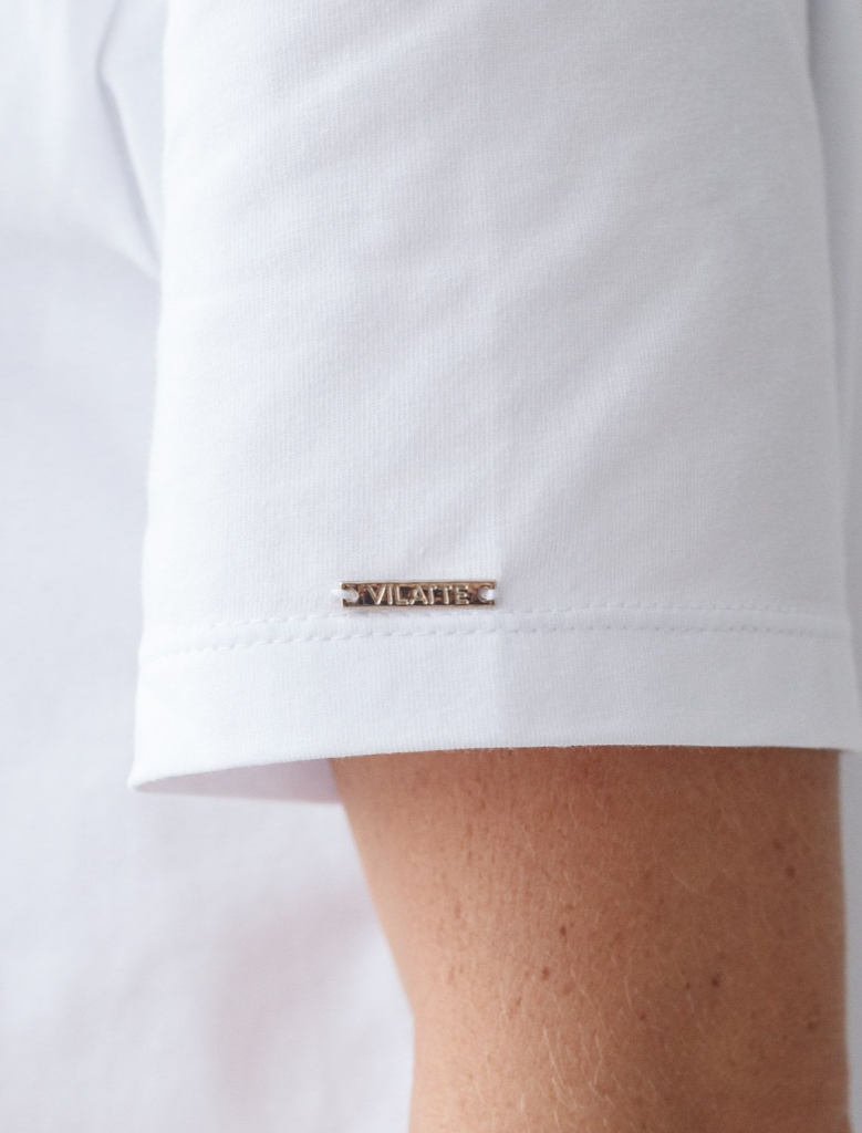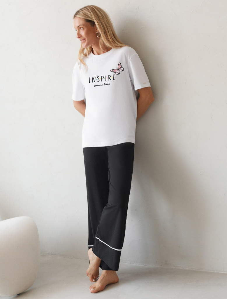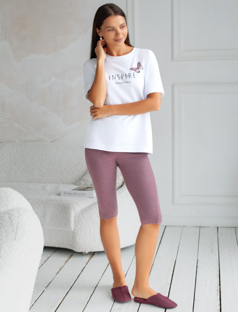 Футболка белого цвета изготовлена из премиального хлопка с эластаном, она обеспечивает невероятное ощущение уюта и легкости. Натуральный материал сохраняет форму и цвет после множества стирок, обеспечивая долговечность изделия, а его высокая воздухопроницаемость создает ощущение свежести даже в течение долгого дня. Особое внимание привлекает стильный принт в виде бабочки с минималистичной надписью, перевод надписи Inspire Someone Today - Вдохновите кого-нибудь сегодня . Принт выполненны красками с устойчивым покрытием, который добавляет изделию оригинальности и позволяет выразить индивидуальность. Свободный крой футболки дарит удобство и не стесняет движений, что делает ее идеальной для повседневной носки или активного отдыха, подчеркивает современный взгляд на моду. На рукаве металлический логотип бренда. Подойдет девушкам и женщинам на любую фигуру, вы будете чувствовать себя в ней уверенно и комфортно. Отлично впишется в гардероб благодаря универсальному дизайну, который легко сочетать с джинсами, шорт