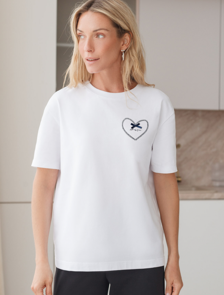 Футболка белого цвета изготовлена из премиального хлопка с эластаном, она обеспечивает невероятное ощущение уюта и легкости. Натуральный материал сохраняет форму и цвет после множества стирок, обеспечивая долговечность изделия, а его высокая воздухопроницаемость создает ощущение свежести даже в течение долгого дня. Особое внимание привлекает стильный принт в виде сердца с минималистичной надписью, перевод надписи All my love - вся моя любовь. Принт выполненны красками с устойчивым покрытием, который добавляет изделию оригинальности и позволяет выразить индивидуальность. Свободный крой футболки дарит удобство и не стесняет движений, что делает ее идеальной для повседневной носки или активного отдыха, подчеркивает современный взгляд на моду. На рукаве металлический логотип бренда. Подойдет девушкам и женщинам на любую фигуру, вы будете чувствовать себя в ней уверенно и комфортно. Отлично впишется в гардероб благодаря универсальному дизайну, который легко сочетать с джинсами, шортами или спортивными брюками.