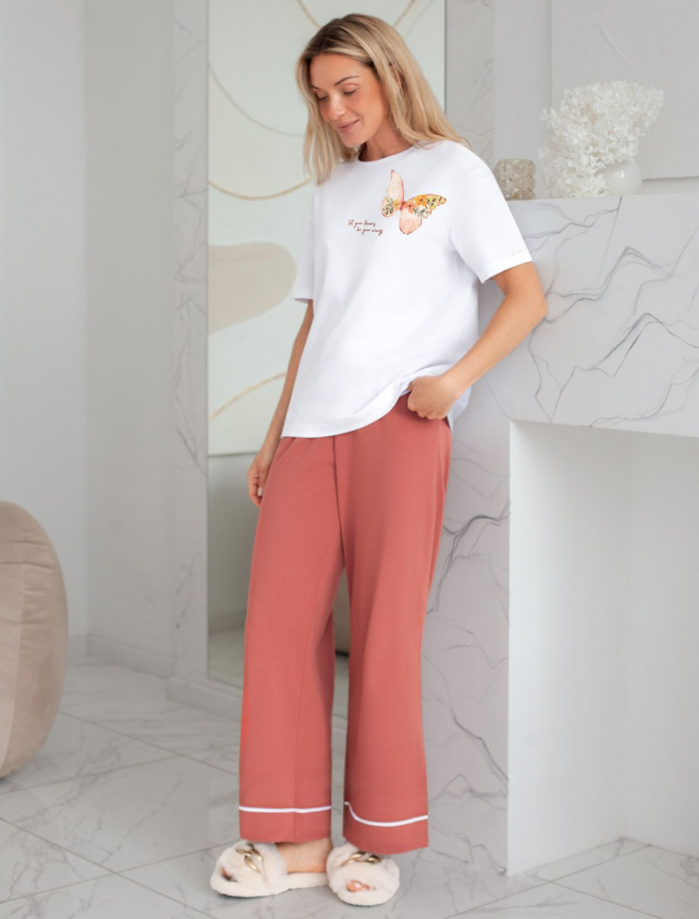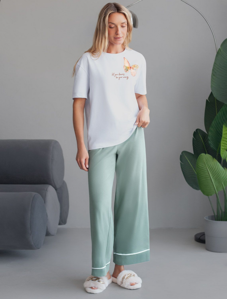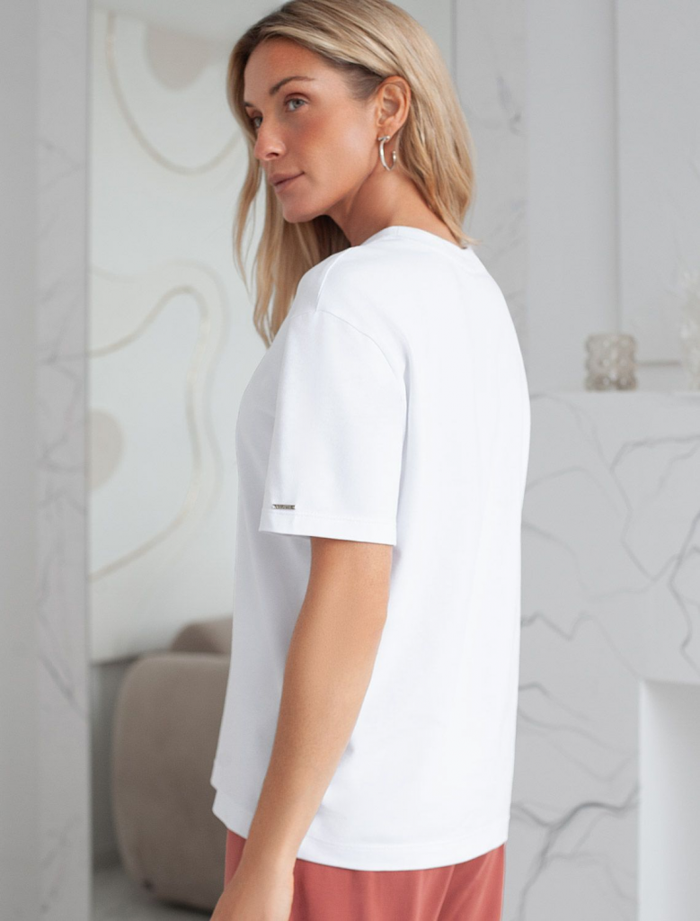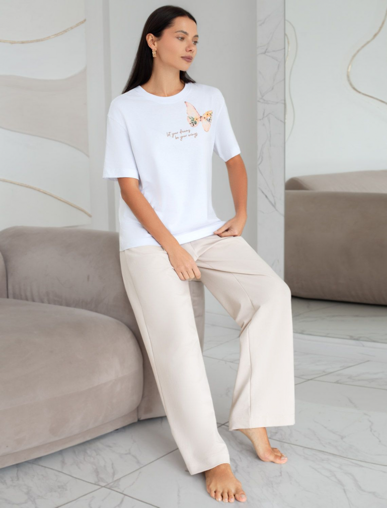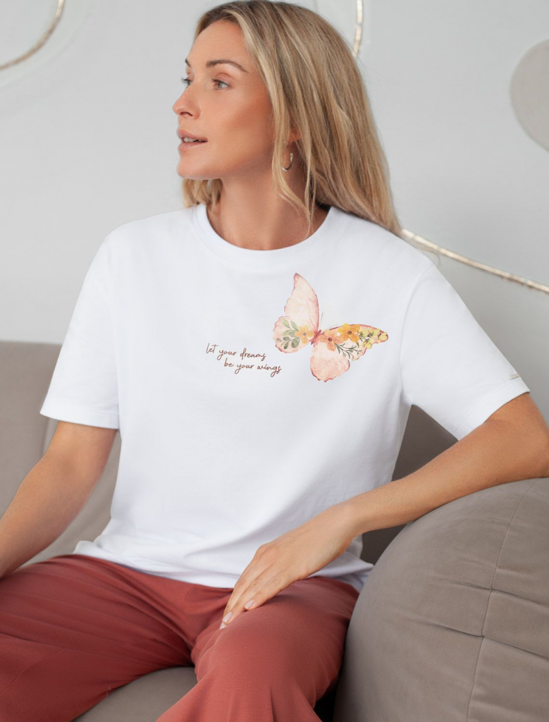 Футболка белого цвета изготовлена из премиального хлопка с эластаном, она обеспечивает невероятное ощущение уюта и легкости. Натуральный материал сохраняет форму и цвет после множества стирок, обеспечивая долговечность изделия, а его высокая воздухопроницаемость создает ощущение свежести даже в течение долгого дня. Особое внимание привлекает стильный принт в виде бабочки с минималистичной надписью. Перевод надписи Let your dreams be your wings - Пусть твои мечты станут твоими крыльями. Принт выполнен красками с устойчивым покрытием, который добавляет изделию оригинальности и позволяет выразить индивидуальность. Свободный крой футболки дарит удобство и не стесняет движений, что делает ее идеальной для повседневной носки или активного отдыха, подчеркивает современный взгляд на моду. На рукаве металлический логотип бренда. Подойдет девушкам и женщинам на любую фигуру, вы будете чувствовать себя в ней уверенно и комфортно. Отлично впишется в гардероб благодаря универсальному дизайну, который легко сочетать с