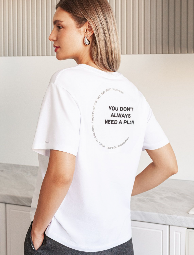 Перевод надписи: «Не всегда нужен план. Иногда просто нужно сделать вдох, довериться, и ты увидишь, что произойдет» Футболка выполнена из премиального хлопка. Крупная надпись выполнена красками, маленькая - золотой фольгой с устойчивым покрытием. Наличие эластана в составе способствует комфорту и формоустойчивости, помогая сохранить изделие в течении долгого времени в идеальном состоянии. Модель дополнена фирменным металлическим логотипом бренда.