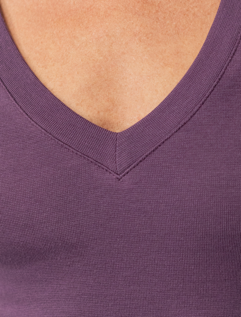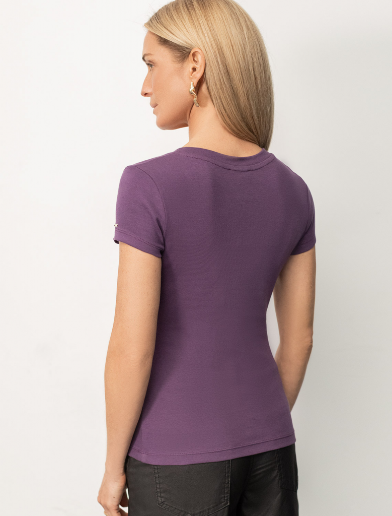 Облегающая футболка с V-образным вырезом цвета бургунди создаст утонченный образ. Идеальная базовая модель для вашего гардероба! Глубокий V-образный вырез подчеркивает линию шеи и зрительно удлиняет силуэт. Футболка выполнена из хлопка с добавлением эластана, которая мягко облегает контуры тела, подчеркивая достоинства фигуры. Универсальный вариант для создания стильных повседневных образов.