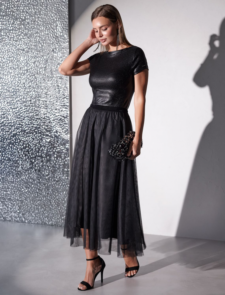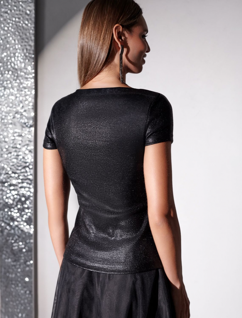 Стильная футболка черного цвета с вырезом лодочка выполнена из премиального хлопка с добавлением эластана. Эффектное матовое покрытие металлик придает футболке изысканный блеск. Вырез лодочка добавляет элегантности и женственности образу. Мелкий рубчик визуально вытягивает силуэт, за счет эластана в составе материал прекрасно тянется и садится на любую фигуру, в том числе большие размеры. Ткань износостойкая, сохраняет свой превоначальный вид даже после многочисленных стирок, отличается мягкостью и приятными тактильными ощущениями, такой материал не раздражает кожу, дарит ощущение уюта даже при длительном ношении, а воздухопроницаемость позволяет коже свободно дышать.Повседневная футболка универсальна: она сочетается с джинсами, юбками или строгими брюками — легко создать как деловой образ для офиса, так и наряд для вечеринки или ужина вне дома. Матовое покрытие создает благородный блеск без лишней яркости, благодаря чему футболка смотрится свежо и актуально.