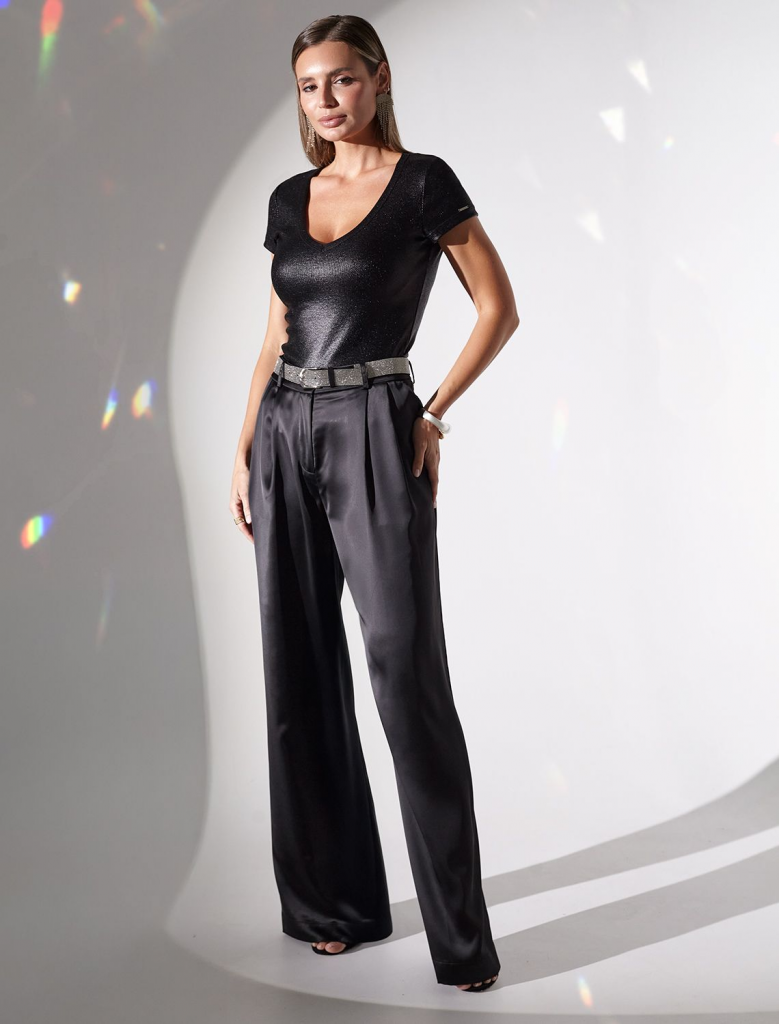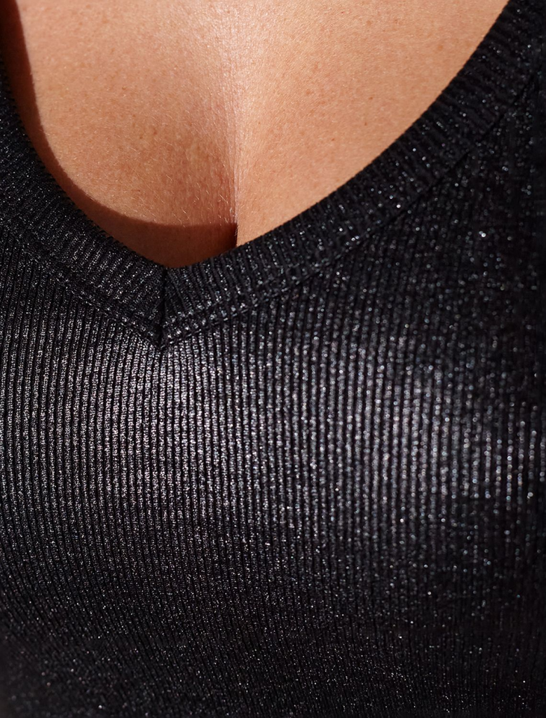 Стильная футболка черного цвета с V вырезом выполнена из премиального хлопка с добавлением эластана. Эффектное матовое покрытие металлик придает футболке изысканный блеск. Чуть удлиненные рукава и глубокий вырез, открывающий область декольте, добавляют женственность и элегантность образу. Мелкий рубчик визуально вытягивает силуэт, за счет эластана в составе материал прекрасно тянется и садится на любую фигуру, в том числе большие размеры. Ткань износостойкая, сохраняет свой превоначальный вид даже после многочисленных стирок, отличается мягкостью и приятными тактильными ощущениями, такой материал не раздражает кожу, дарит ощущение уюта даже при длительном ношении, а воздухопроницаемость позволяет коже свободно дышать.Повседневная футболка универсальна: она сочетается с джинсами, юбками или строгими брюками — легко создать как деловой образ для офиса, так и наряд для вечеринки или ужина вне дома. Матовое покрытие создает благородный блеск без лишней яркости, благодаря чему футболка смотрится свежо и акту