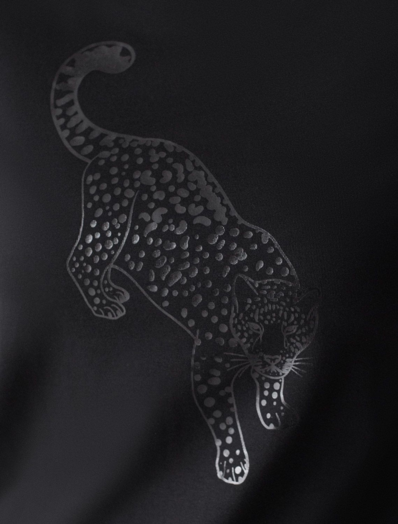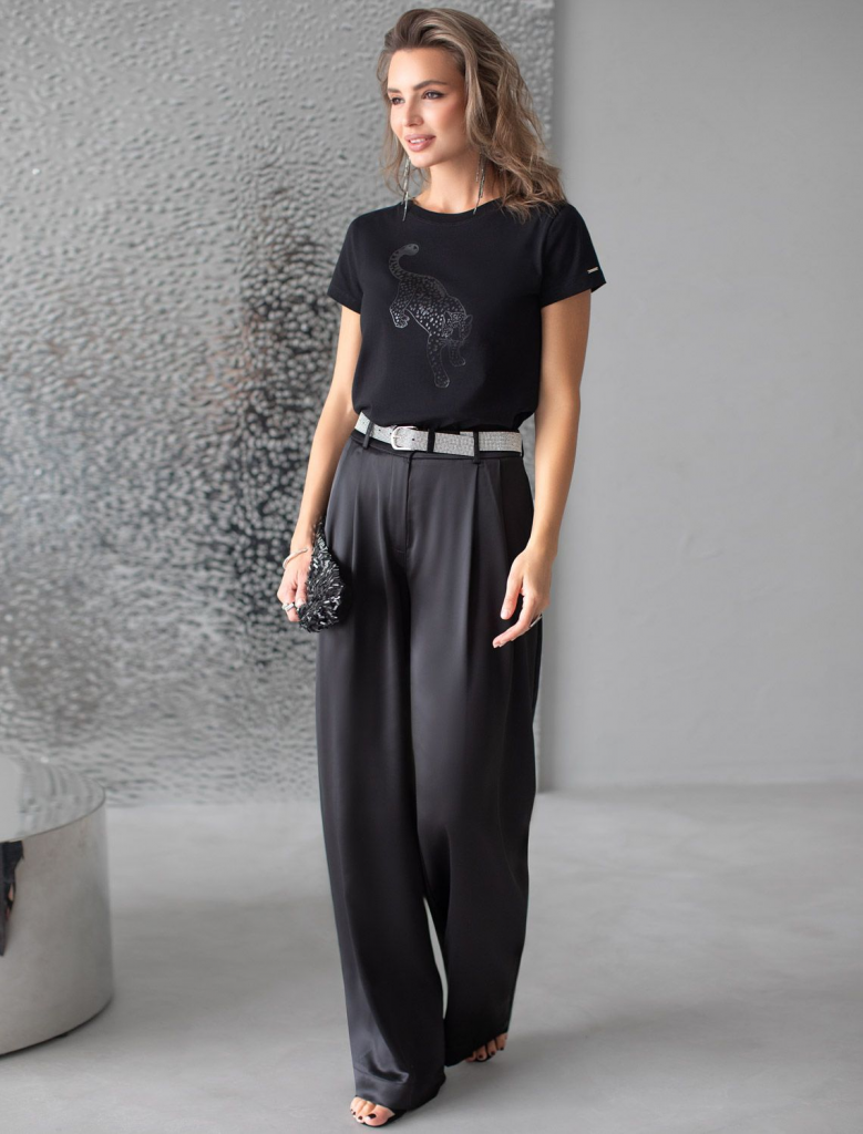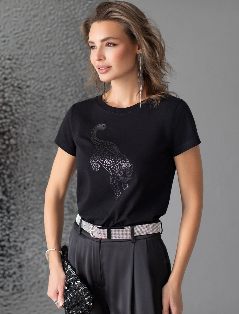 Стильная базовая футболка черного цвета с серебристым принтом фольгой выполнена из плотного хлопка с эластаном для комфортной посадки на любую фигуру. Прямая футболка классического кроя с круглым вырезом, прекрасно подходит для разных типов фигуры, в том числе и на большие размеры. Мягкость хлопка вместе с небольшой долей эластана гарантирует идеальную посадку и свободу движений. Легкая натуральная дышащая ткань премиального качества делает футболку с коротким рукавом идеальным вариантом для повседневной носки дома, на работу или офис. Однотонная футболка дополнена авторским аккуратным принтом с изображением леопарда, который придает праздничный и элегантный вид без лишней вычурности. Блестящий анималистичный принт аккуратно украшает, добавляя изысканный акцент и создавая легкий мерцающий эффект. Эта эффектная футболка станет отличным выбором на праздник, подчеркивая образ сияющей и уверенной в себе девушки или женщины. Если вы ищете комфортный и одновременно привлекательный наряд для особых моментов, эта