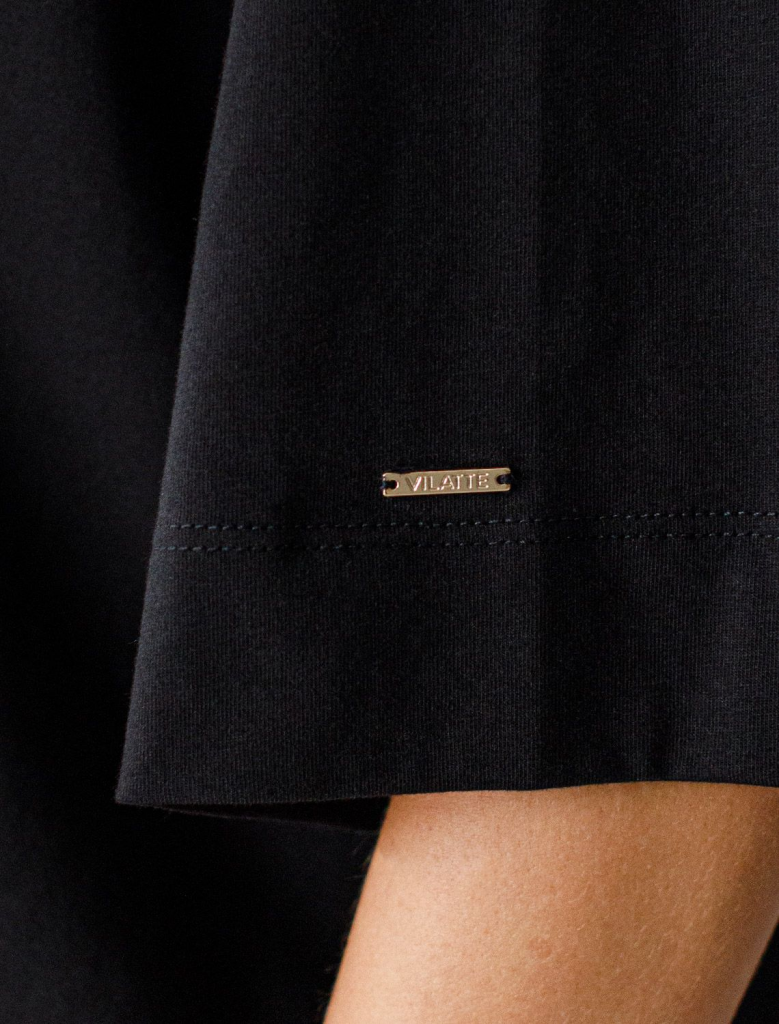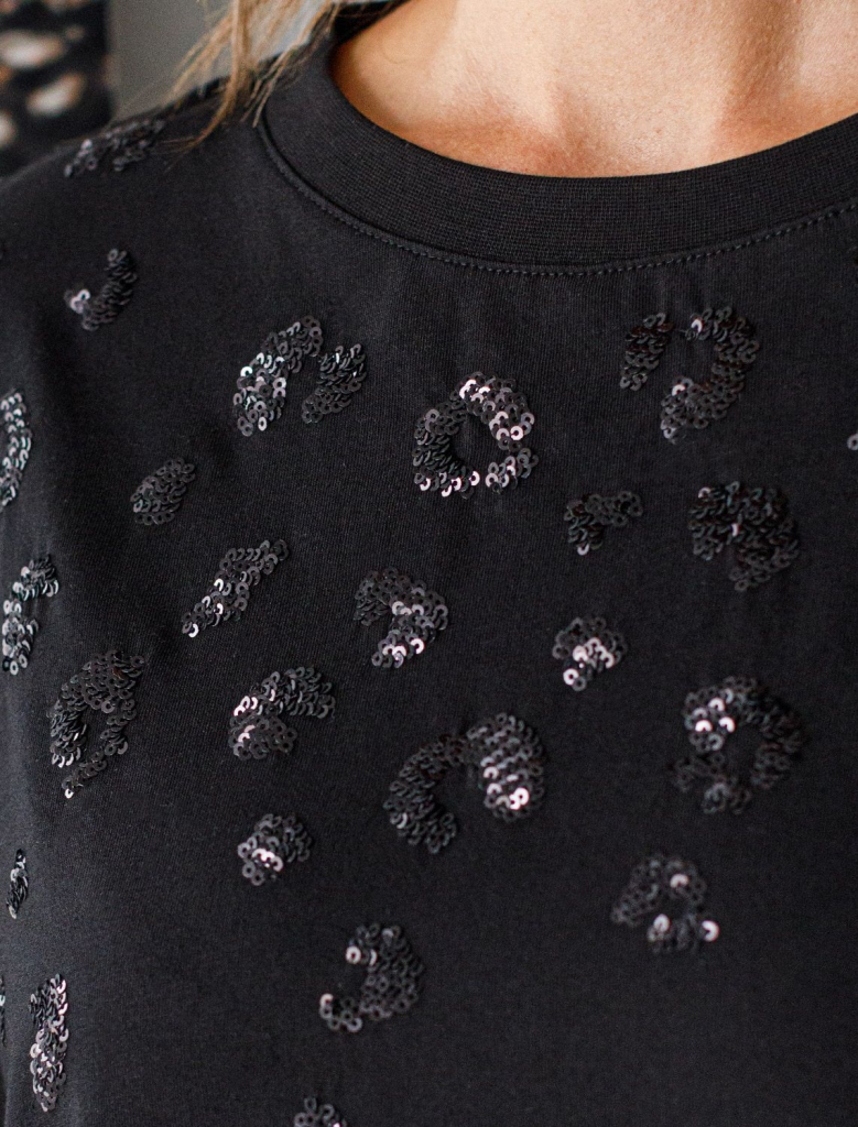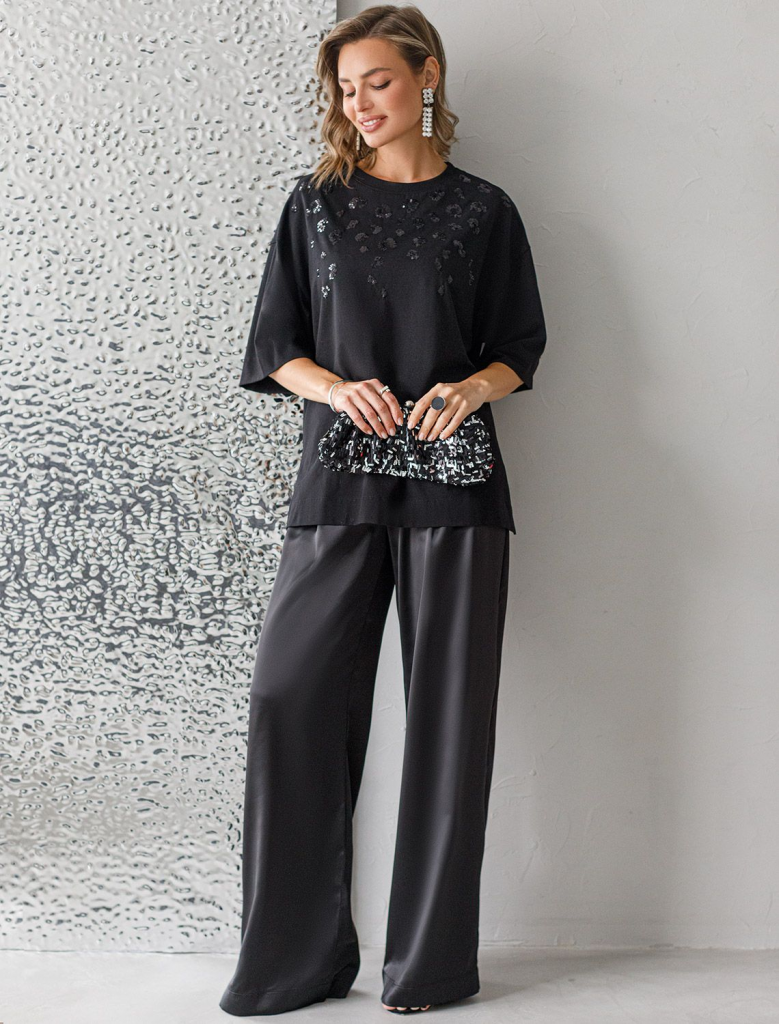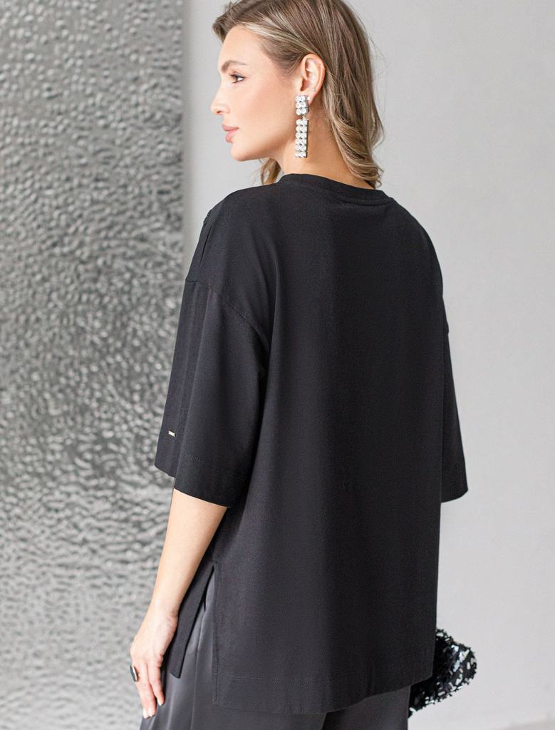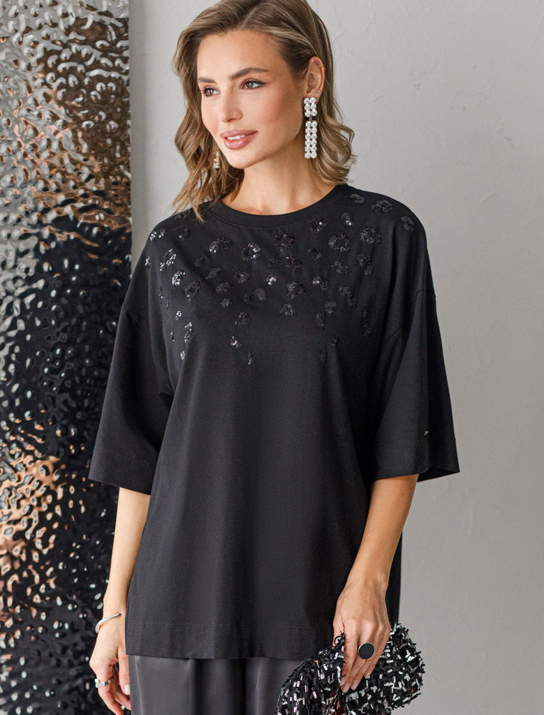 Оверсайз футболка черного цвета из премиального хлопка с добавлением эластана создана для комфорта и стиля каждый день. Натуральный материал приятный к телу, дышащая ткань хорошо держит форму и подходит для повседневной носки дома, в офисе или на прогулке. Классический свободный крой, удлиненный прямой силуэт и свободная посадка делают эту базовую футболку универсальным решением для любой фигуры и роста, включая плюс сайз размеры и беременных девушек, отлично скроет животик. Широкие рукава держат форму и подойдут на полные руки. Нарядная футболка украшена авторским принтом пайетками. Такой акцент делает модель уместной как для особых случаев, так и для ежедневных образов.Такая эффектная длинная футболка станет универсальным дополнением гардероба, позволяя создавать разнообразные образы с акцентом на современный стиль и утонченность деталей. Благодаря стильному дизайну с боковыми разрезами эта футболка станет идеальным вариантом для создания легких и непринужденных луков.