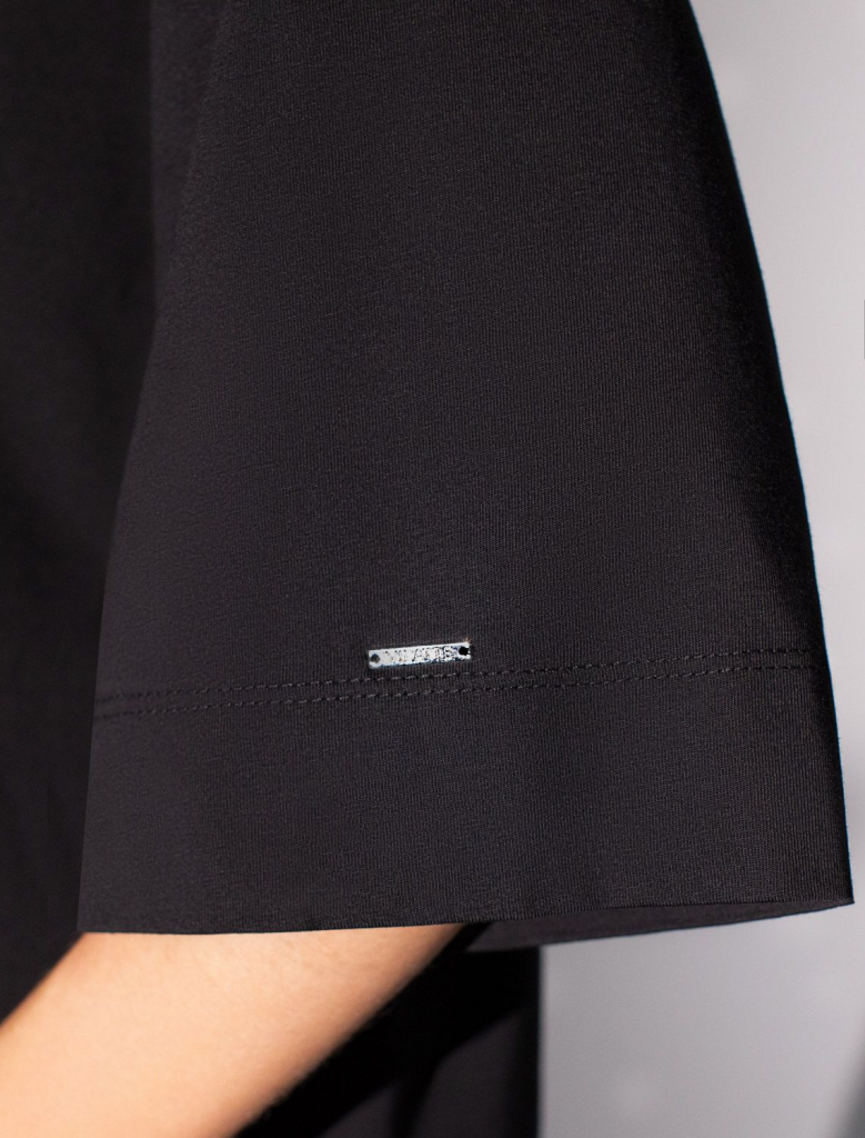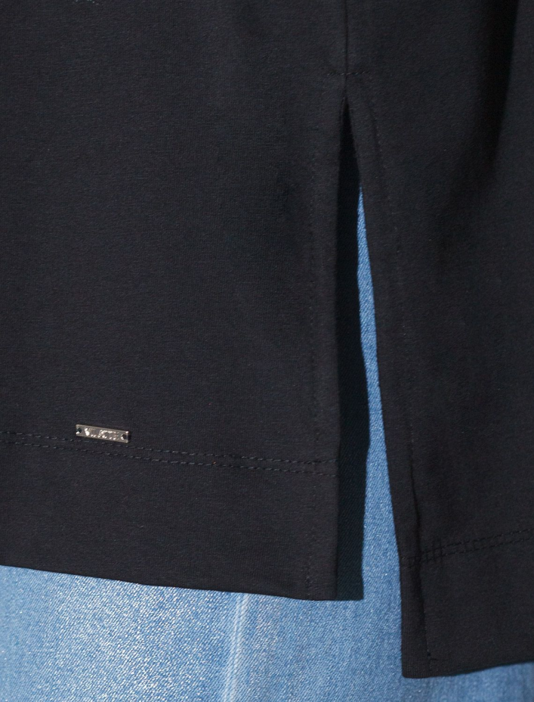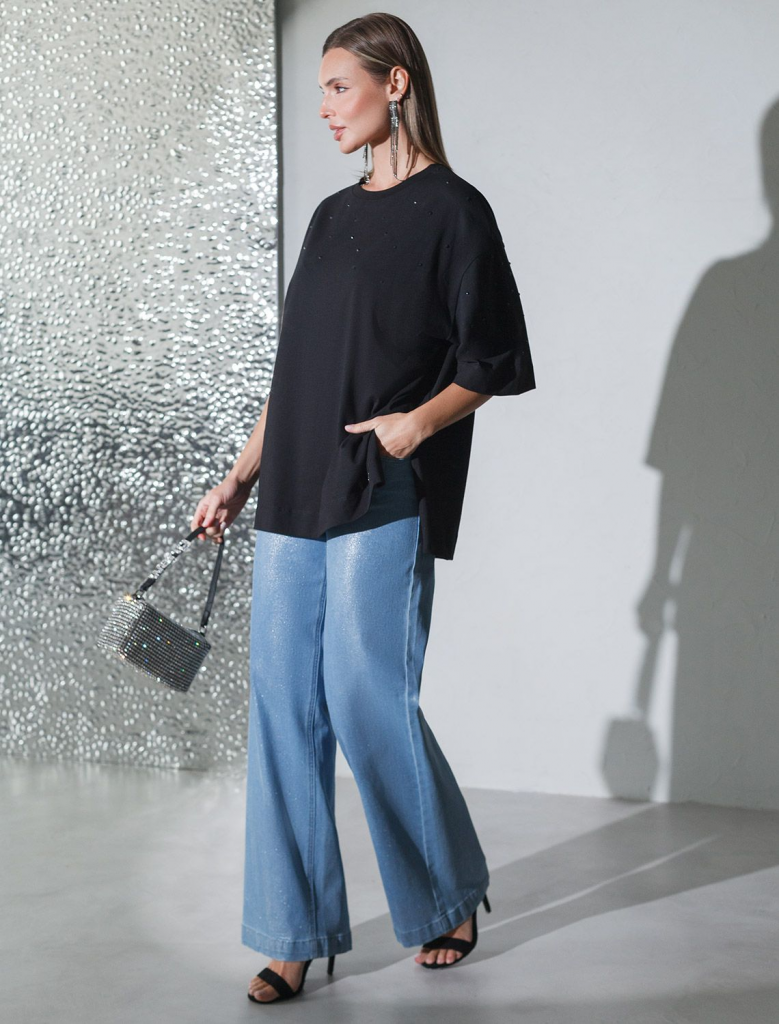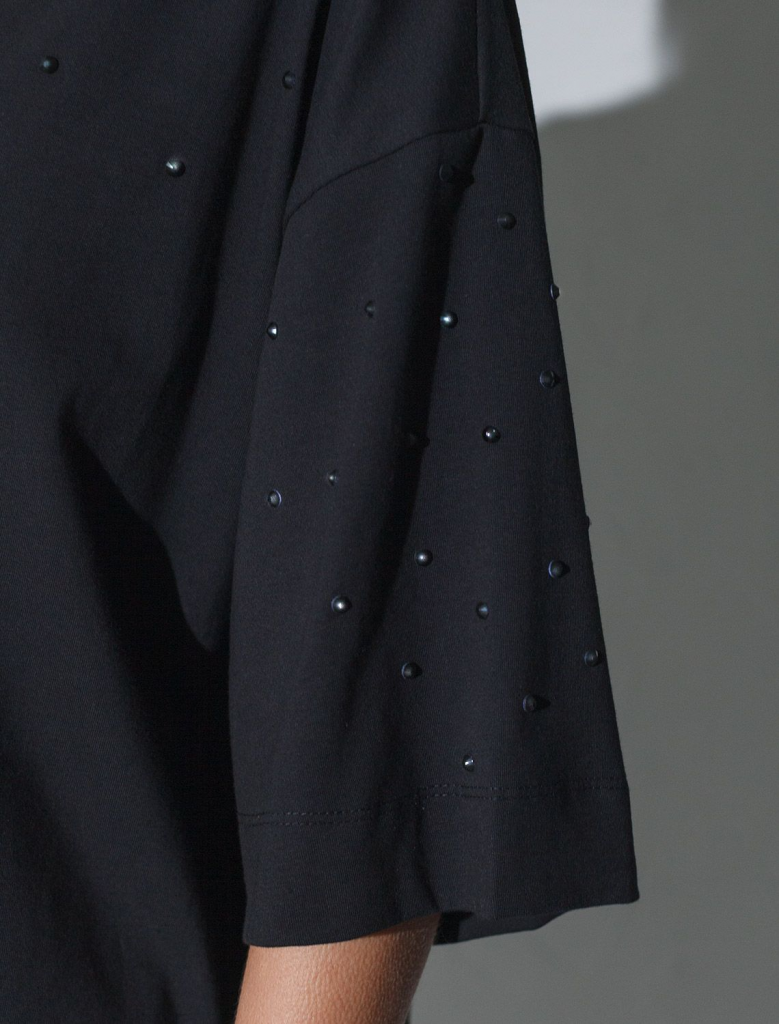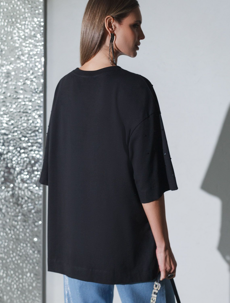 Оверсайз футболка черного цвета из премиального хлопка с добавлением эластана создана для комфорта и стиля каждый день. Натуральный материал приятный к телу, дышащая ткань хорошо держит форму и подходит для повседневной носки дома, в офисе или на прогулке. Классический свободный крой, удлиненный прямой силуэт и свободная посадка делают эту базовую футболку универсальным решением для любой фигуры и роста, включая плюс сайз размеры и беременных девушек, отлично скроет животик. Широкие рукава держат форму и подойдут на полные руки. Нарядная футболка украшена авторским принтом в виде россыпи страз в тон основного полотна, которые создают красивый мерцающий эффект. Такой акцент делает модель уместной как для особых случаев, так и для ежедневных образов.Такая эффектная футболка станет универсальным дополнением гардероба, позволяя создавать разнообразные образы с акцентом на современный стиль и утонченность деталей. Благодаря стильному дизайну с боковыми разрезами эта футболка станет идеальным вариантом для создани