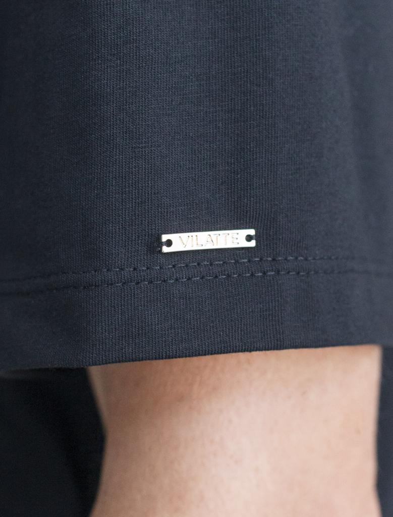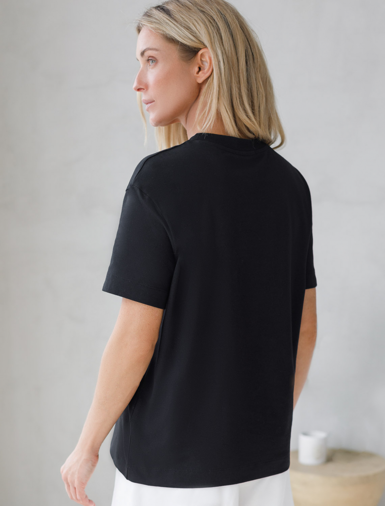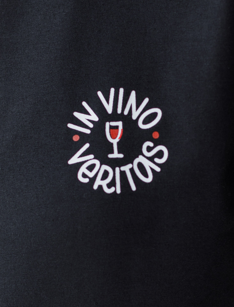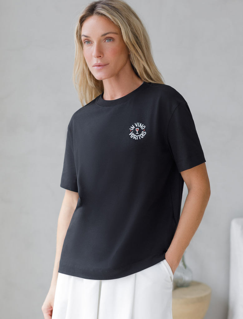 Футболка черного цвета изготовлена из премиального хлопка с эластаном, она обеспечивает невероятное ощущение уюта и легкости. Натуральный материал сохраняет форму и цвет после множества стирок, обеспечивая долговечность изделия, а его высокая воздухопроницаемость создает ощущение свежести даже в течение долгого дня. Особое внимание привлекает стильный принт в виде бокала с минималистичной надписью. Перевод надписи: In vino veritas - Приходит вино - уходит истина. Принт выполнен красками с устойчивым покрытием, который добавляет изделию оригинальности и позволяет выразить индивидуальность. Свободный крой футболки дарит удобство и не стесняет движений, что делает ее идеальной для повседневной носки или активного отдыха, подчеркивает современный взгляд на моду. На рукаве металлический логотип бренда. Подойдет девушкам и женщинам на любую фигуру, вы будете чувствовать себя в ней уверенно и комфортно. Отлично впишется в гардероб благодаря универсальному дизайну, который легко сочетать с джинсами, шортами или с
