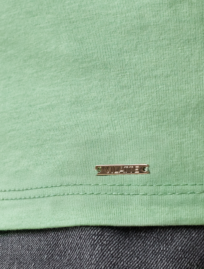 Футболка из 100% хлопка с цельнокроеным рукавом. Изделие отлично держит форму, почти не мнется и комфортно сидит по фигуре. Отдельным украшением служит металлический логотип бренда.