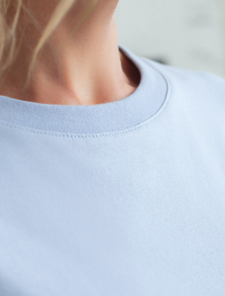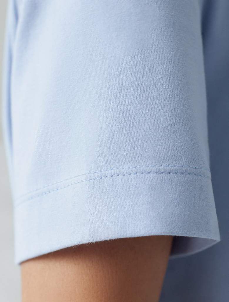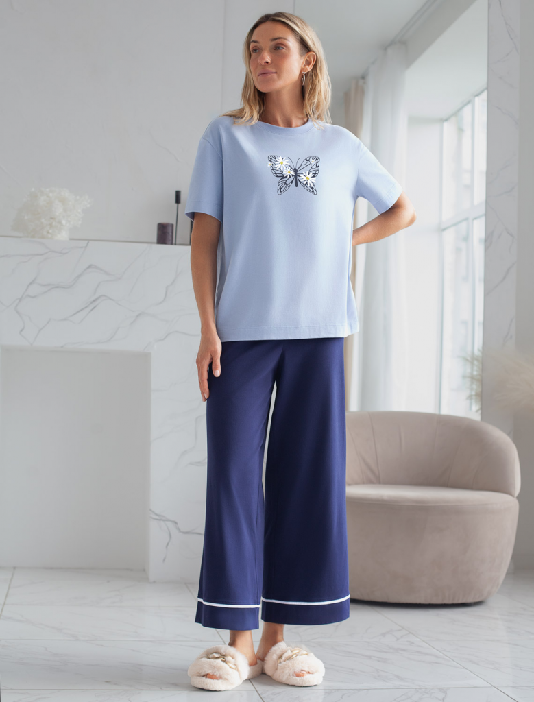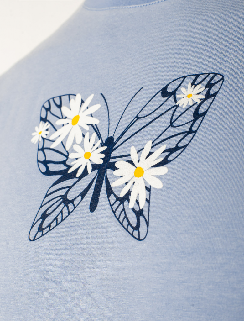 Футболка нежного голубого цвета изготовлена из премиального хлопка с эластаном, она обеспечивает невероятное ощущение уюта и легкости. Натуральный материал сохраняет форму и цвет после множества стирок, обеспечивая долговечность изделия, а его высокая воздухопроницаемость создает ощущение свежести даже в течение долгого дня. Особое внимание привлекает стильный принт в виде бабочки с цветами. Принт выполнен красками с устойчивым покрытием, который добавляет изделию оригинальности и позволяет выразить индивидуальность. Свободный крой футболки дарит удобство и не стесняет движений, что делает ее идеальной для повседневной носки или активного отдыха, подчеркивает современный взгляд на моду. На рукаве металлический логотип бренда. Подойдет девушкам и женщинам на любую фигуру, вы будете чувствовать себя в ней уверенно и комфортно. Отлично впишется в гардероб благодаря универсальному дизайну, который легко сочетать с джинсами, шортами или спортивными брюками.