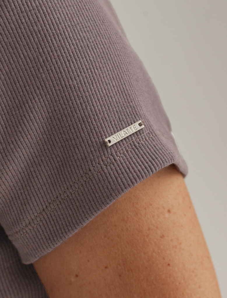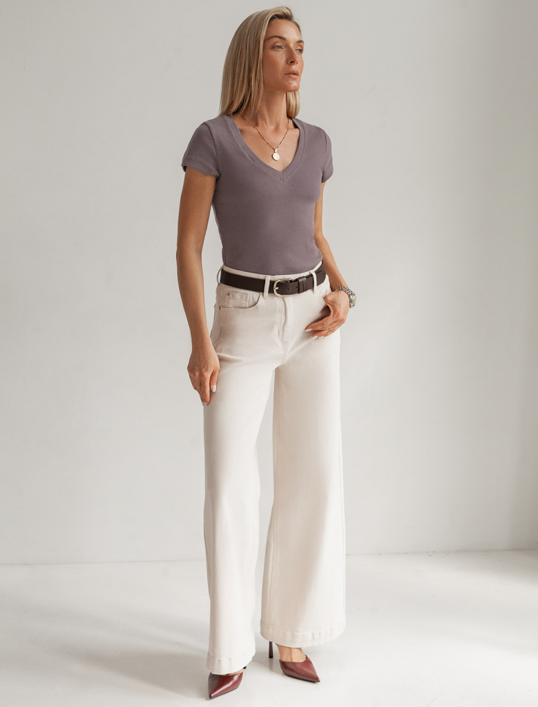 Стильная облегающая футболка кофейного цвета с V-образным вырезом сшита из плотного хлопкового трикотажа в рубчик с добавлением эластана, что гарантирует комфортную посадку по фигуре. V-вырез подчеркивает линию декольте, добавляя образу нотку элегантности. Практичная модель, которая не деформируется после стирок и сочетается с любым стилем одежды - от кэжуал до смарт-кэжуал.