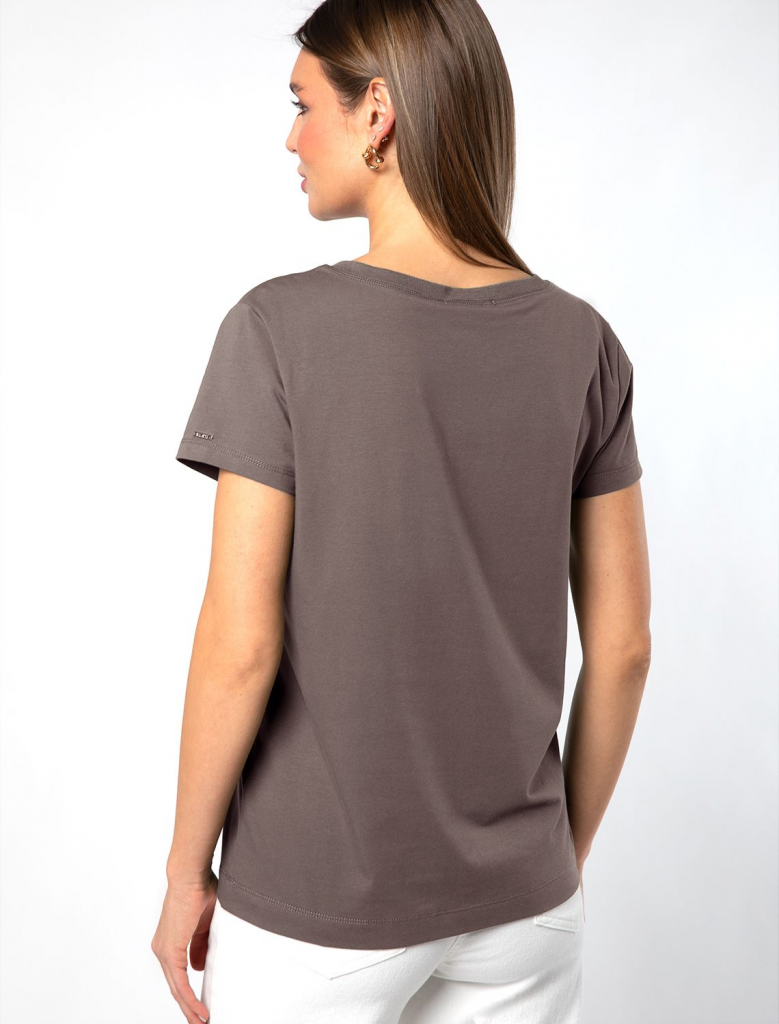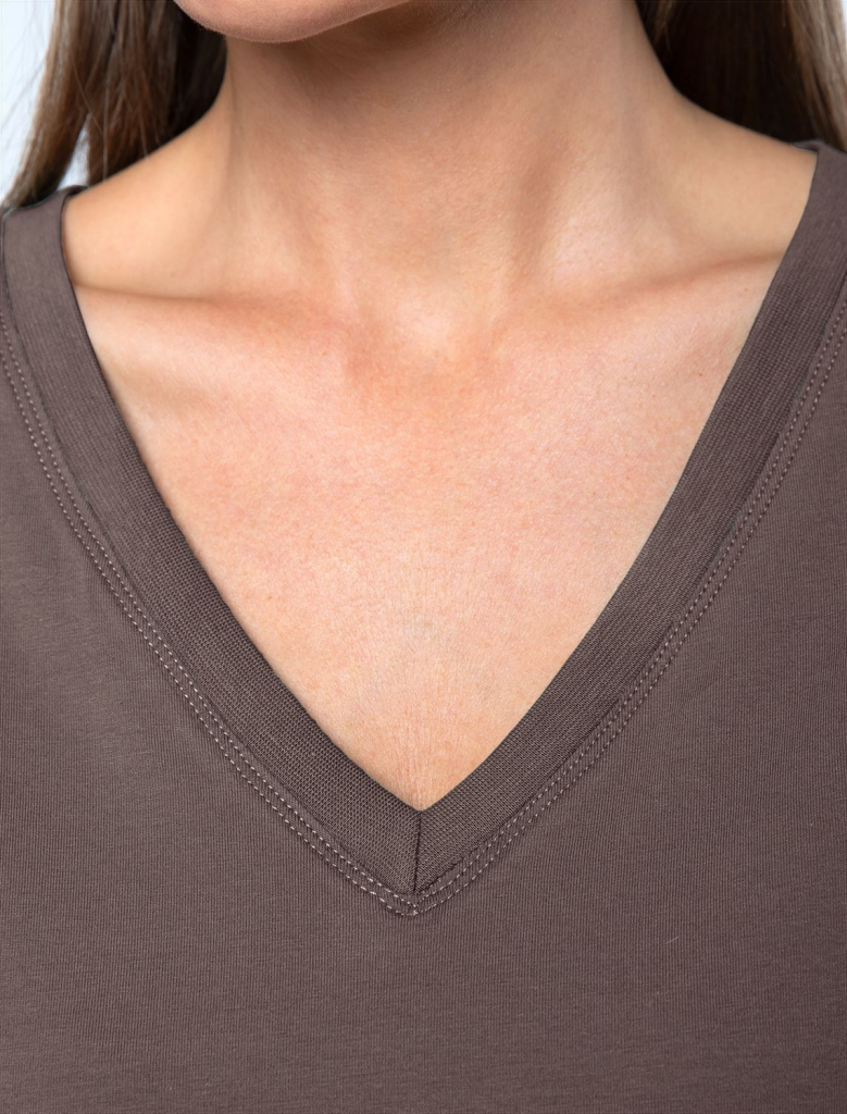 Однотонная футболка с V-образным вырезом выполнена из премиального хлопка. Добавление эластана в состав изделия способствует формоустойчивости. Самое высокое качество длинноволокнистых хлопковых волокон обеспечивает комфорт в любое время года. Совет стилиста: очищенная от декора базовая модель будет уместна не только в повседневном образе с денимом, но и в офисе с нестрогим дресс-кодом, в паре с брюками и жакетом.