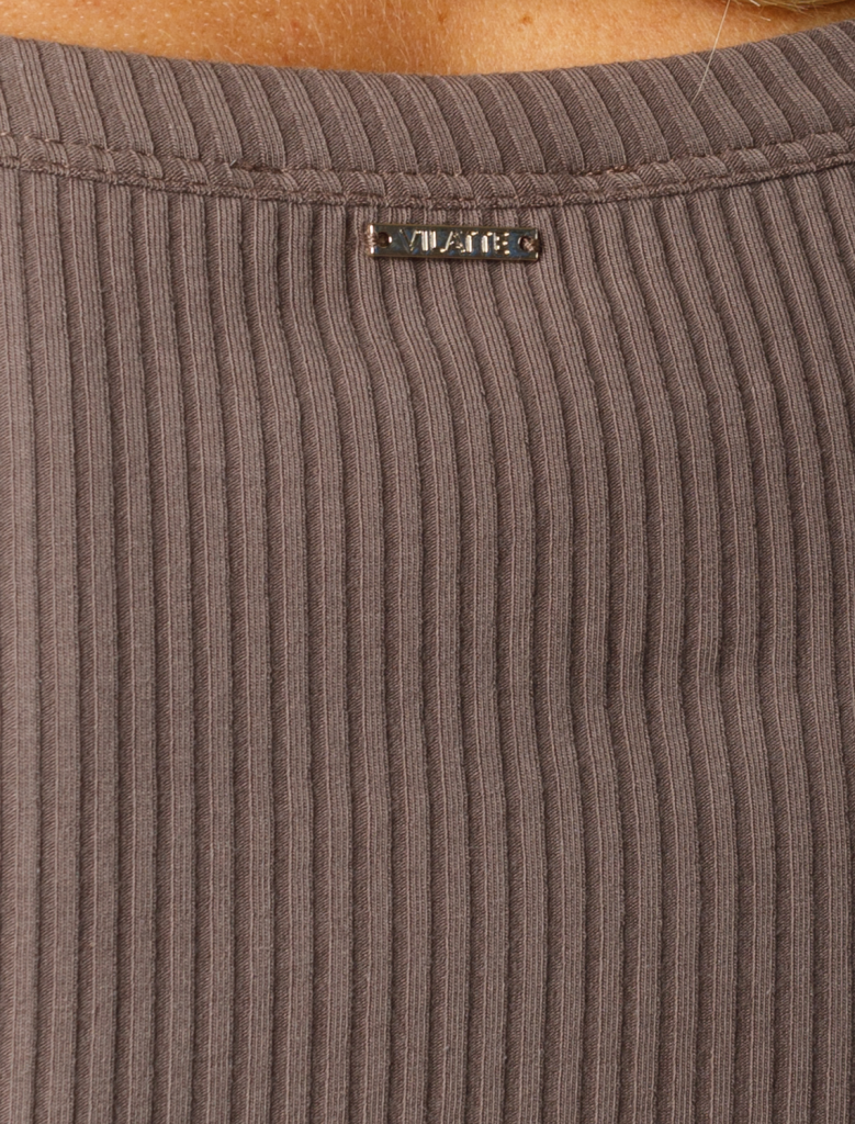 Футболка выполнена из трикотажа в широкий рубчик. Модель с круглым вырезом. Эластичный хлопковый трикотаж сидит по фигуре, не сковывает движений и очень комфортный в носке. Фактура вертикальных полос визуально стройнит и вытягивает силуэт. Базовое изделие хорошо впишется в любой гардероб. Идеально подходит для многослойных образов.