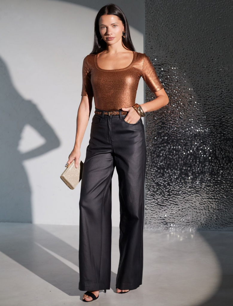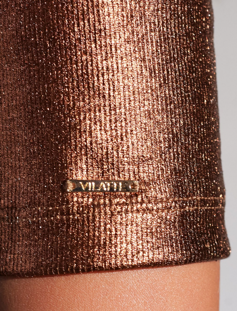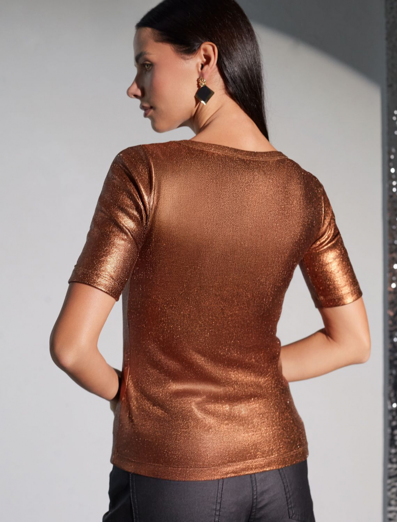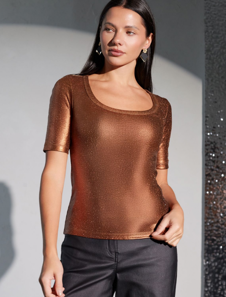 Стильная футболка кофейного цвета с U вырезом выполнена из премиального хлопка с добавлением эластана. Эффектное матовое покрытие металлик придает футболке изысканный блеск. Чуть удлиненные рукава и глубокий круглый вырез, открывающий область декольте, добавляют женственность и элегантность образу. Мелкий рубчик визуально вытягивает силуэт, за счет эластана в составе материал прекрасно тянется и садится на любую фигуру, в том числе большие размеры. Ткань износостойкая, сохраняет свой превоначальный вид даже после многочисленных стирок, отличается мягкостью и приятными тактильными ощущениями, такой материал не раздражает кожу, дарит ощущение уюта даже при длительном ношении, а воздухопроницаемость позволяет коже свободно дышать.Повседневная футболка универсальна: она сочетается с джинсами, юбками или строгими брюками — легко создать как деловой образ для офиса, так и наряд для вечеринки или ужина вне дома. Матовое покрытие создает благородный блеск без лишней яркости, благодаря чему футболка смотрится св