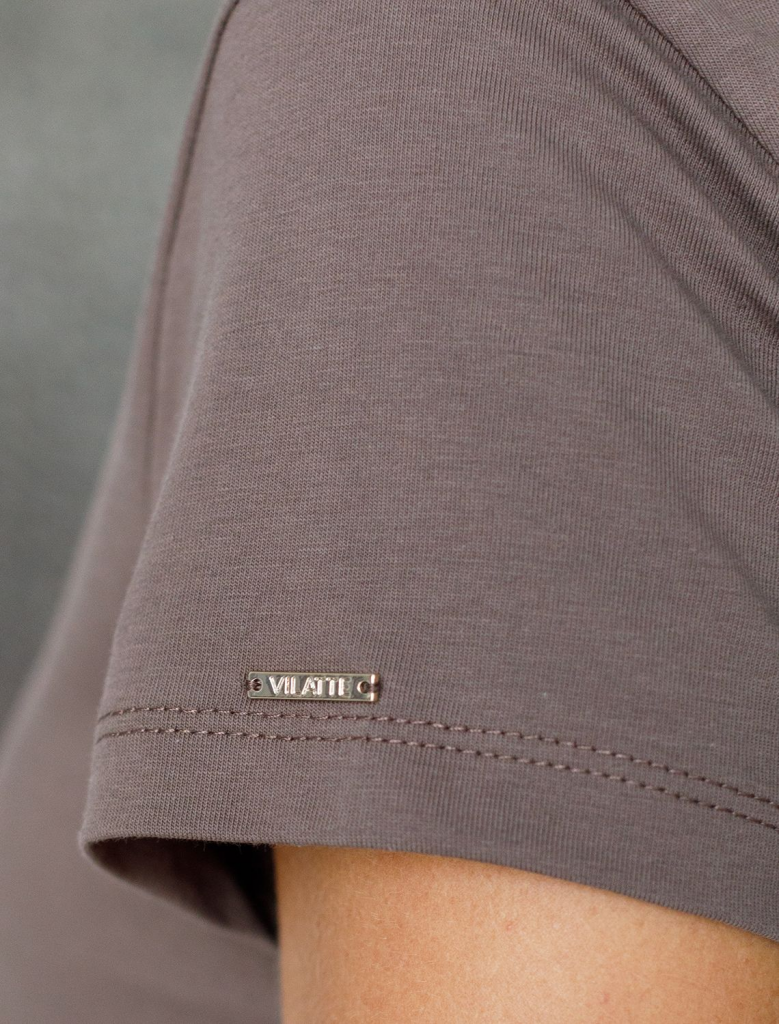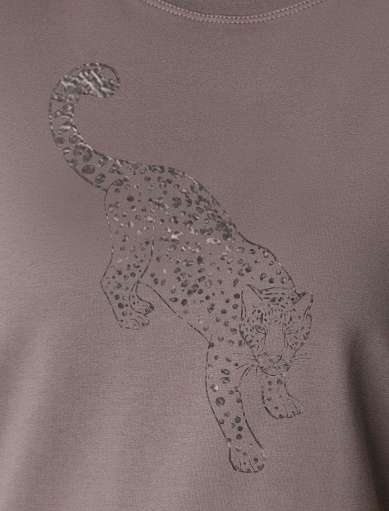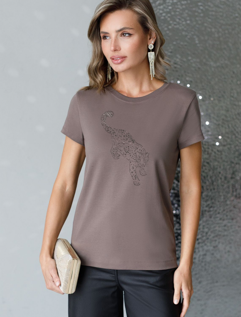 Стильная базовая футболка кофейного цвета с серебристым принтом фольгой выполнена из плотного хлопка с эластаном для комфортной посадки на любую фигуру. Прямая футболка классического кроя с круглым вырезом, прекрасно подходит для разных типов фигуры, в том числе и на большие размеры. Мягкость хлопка вместе с небольшой долей эластана гарантирует идеальную посадку и свободу движений. Легкая натуральная дышащая ткань премиального качества делает футболку с коротким рукавом идеальным вариантом для повседневной носки дома, на работу или офис. Однотонная футболка дополнена авторским аккуратным принтом с изображением леопарда, который придает праздничный и элегантный вид без лишней вычурности. Блестящий анималистичный принт аккуратно украшает, добавляя изысканный акцент и создавая легкий мерцающий эффект. Эта эффектная футболка станет отличным выбором на праздник, подчеркивая образ сияющей и уверенной в себе девушки или женщины. Если вы ищете комфортный и одновременно привлекательный наряд для особых моментов, э