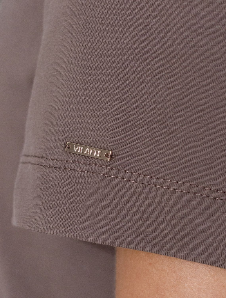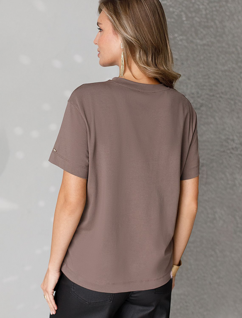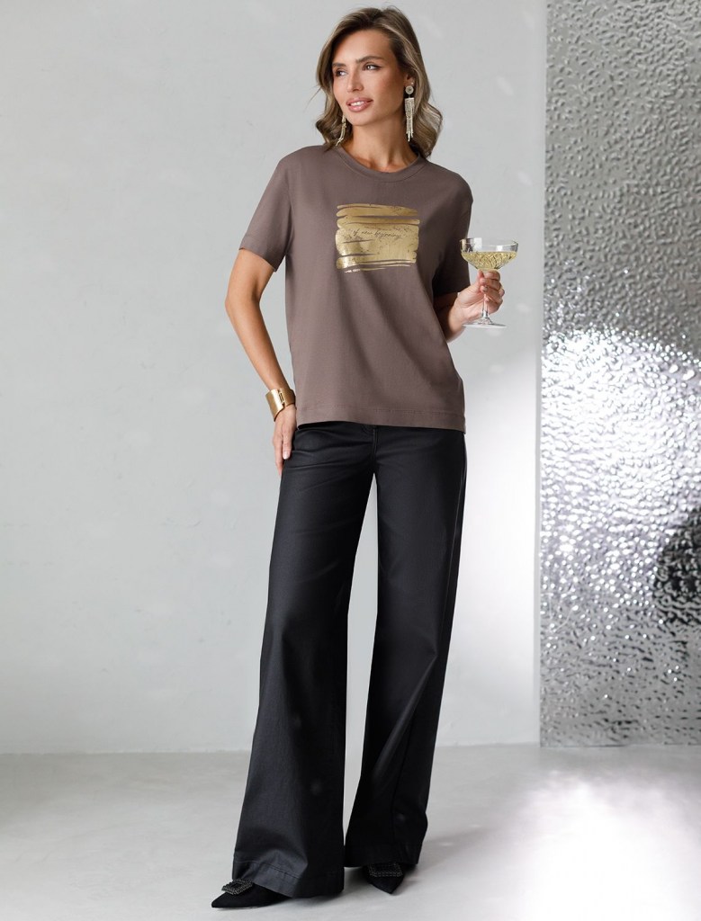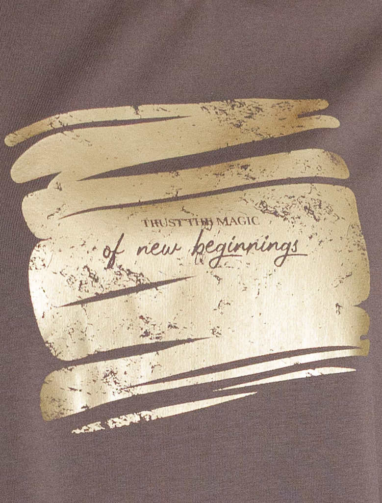 Стильная базовая футболка кофейного цвета с золотистым принтом фольгой выполнена из плотного хлопка с эластаном для комфортной посадки на любую фигуру. Прямая футболка классического кроя с круглым вырезом, прекрасно подходит для разных типов фигуры, в том числе и на большие размеры. Мягкость хлопка вместе с небольшой долей эластана гарантирует идеальную посадку и свободу движений. Легкая натуральная дышащая ткань премиального качества делает футболку с коротким рукавом идеальным вариантом для повседневной носки дома, на работу или офис. Однотонная футболка дополнена авторским аккуратным принтом с минималистичной надписью, который придает праздничный и элегантный вид без лишней вычурности. Блестящий принт аккуратно украшает, добавляя изысканный акцент и создавая легкий мерцающий эффект. Перевод надписи Trust the magic of new beginnings - Доверьтесь магии новых начинаний.Эта эффектная футболка станет отличным выбором на праздник, подчеркивая образ сияющей и уверенной в себе девушки или женщины. Если вы ище