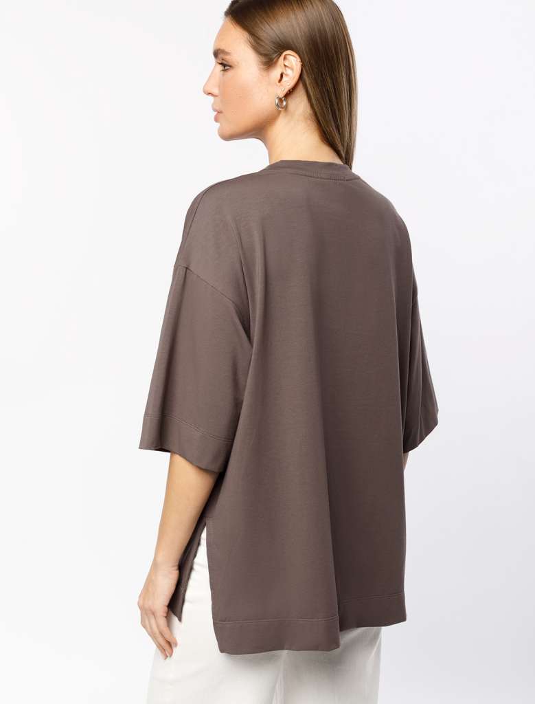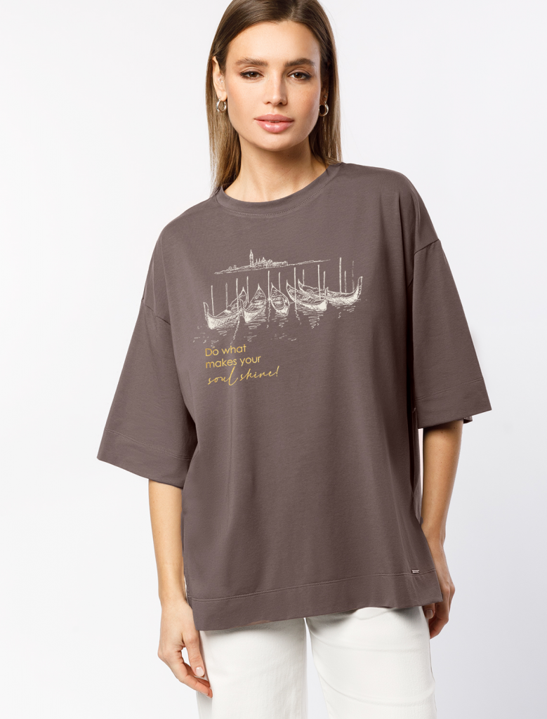Футболка выполнена из эластичного хлопка. Авторский принт нанесен фактурной краской с устойчивым покрытием. Модель дополнена боковыми разрезами и фирменным логотипом бренда по низу изделия. Спинка немного длиннее. Свободный крой подходит для любой фигуры и не сковывает движений.