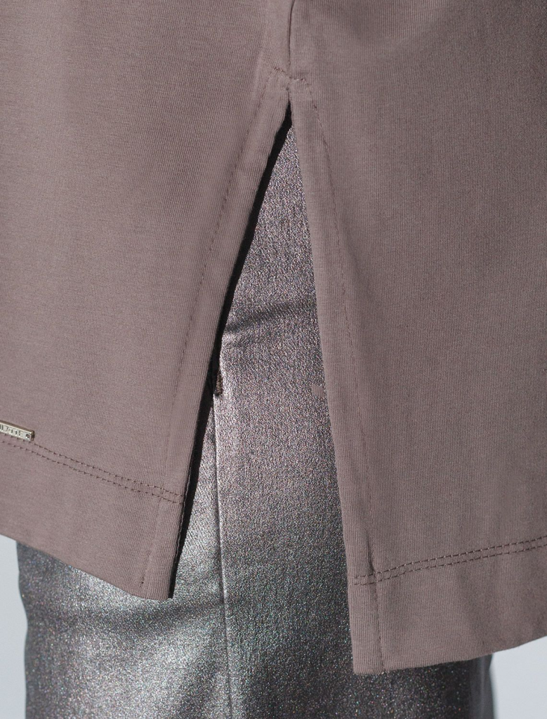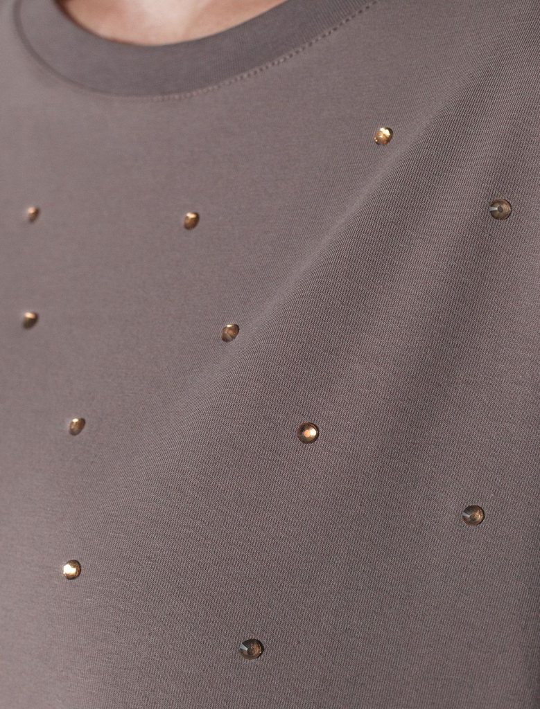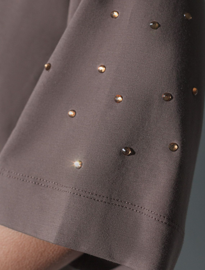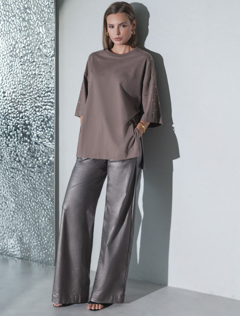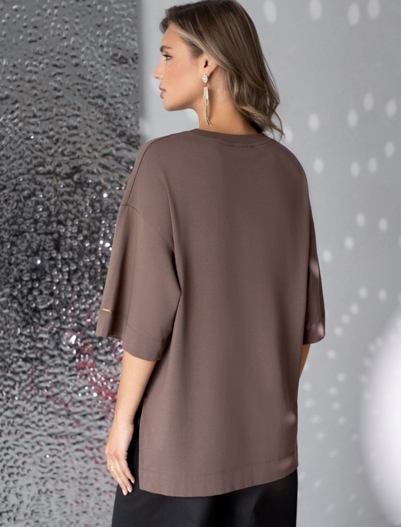 Оверсайз футболка кофейного цвета из премиального хлопка с добавлением эластана создана для комфорта и стиля каждый день. Натуральный материал приятный к телу, дышащая ткань хорошо держит форму и подходит для повседневной носки дома, в офисе или на прогулке. Классический свободный крой, удлиненный прямой силуэт и свободная посадка делают эту базовую футболку универсальным решением для любой фигуры и роста, включая плюс сайз размеры и беременных девушек, отлично скроет животик. Широкие рукава держвт форму и подойдут на полные руки. Нарядная футболка украшена авторским принтом в виде россыпи страз в тон основного полотна, которые создают красивый мерцающий эффект. Такой акцент делает модель уместной как для особых случаев, так и для ежедневных образов.Такая эффектная длинная футболка станет универсальным дополнением гардероба, позволяя создавать разнообразные образы с акцентом на современный стиль и утонченность деталей. Благодаря стильному дизайну с боковыми разрезами эта футболка станет идеальным вариантом