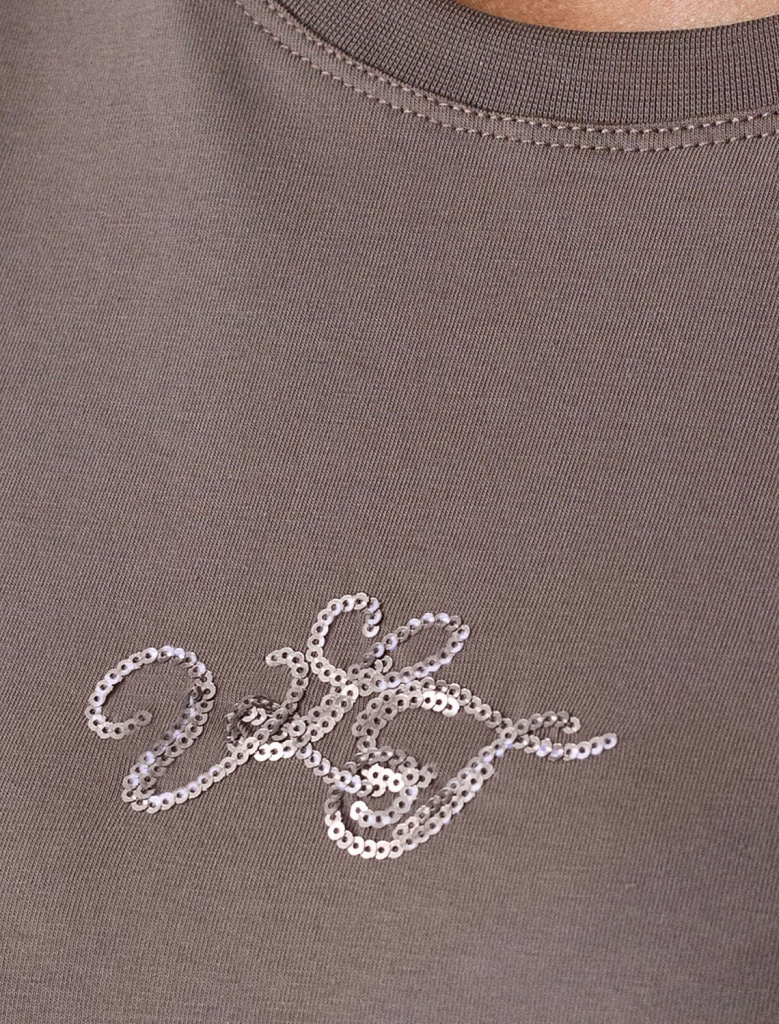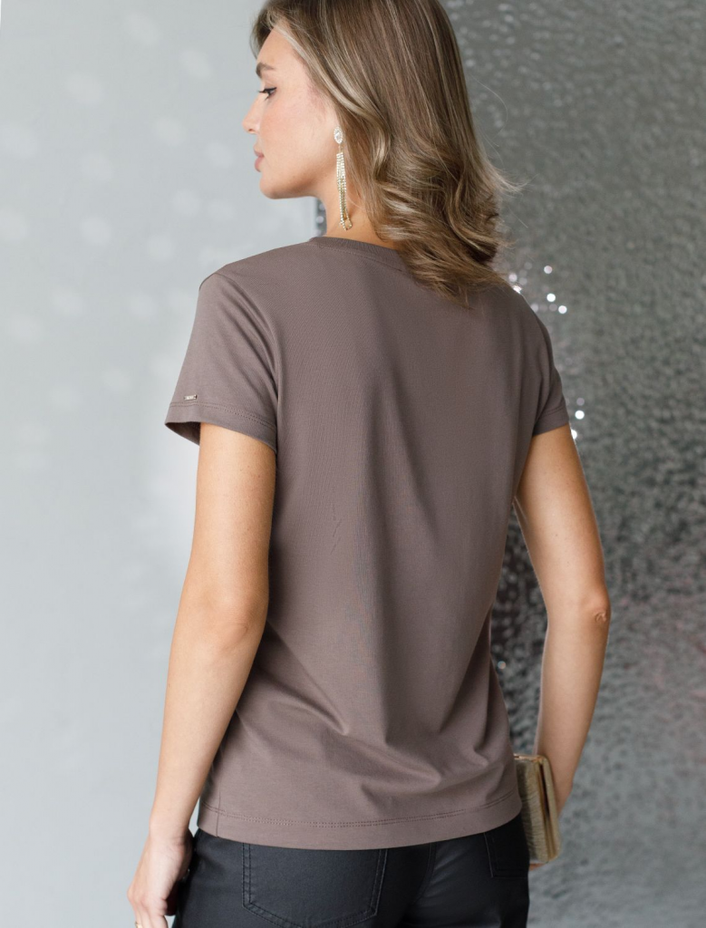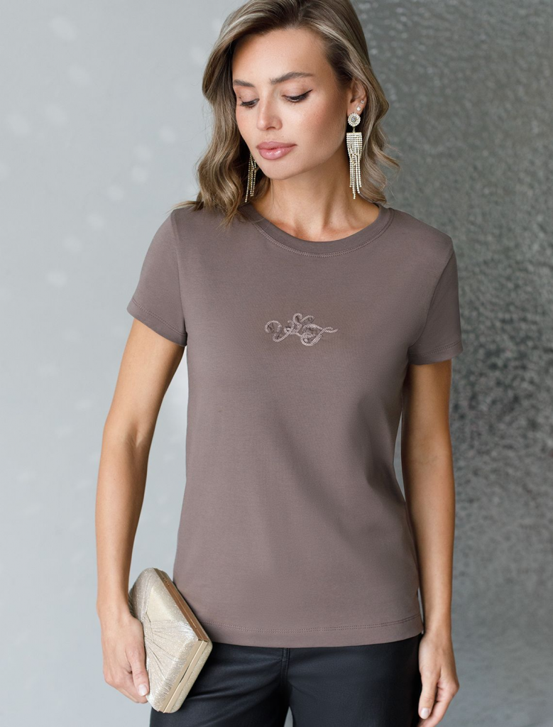 Стильная базовая футболка кофейного цвета с серебристым принтом пайетками выполнена из плотного хлопка с эластаном для комфортной посадки на любую фигуру. Прямая футболка классического кроя с круглым вырезом, прекрасно подходит для разных типов фигуры, в том числе и на большие размеры. Мягкость хлопка вместе с небольшой долей эластана гарантирует идеальную посадку и свободу движений. Легкая натуральная дышащая ткань премиального качества делает футболку с коротким рукавом идеальным вариантом для повседневной носки дома, на работу или офис. Однотонная футболка дополнена авторским аккуратным принтом, который придает праздничный и элегантный вид без лишней вычурности. Блестящий принт аккуратно украшает, добавляя изысканный акцент и создавая легкий мерцающий эффект. Эта эффектная футболка станет отличным выбором на праздник, подчеркивая образ сияющей и уверенной в себе девушки или женщины. Если вы ищете комфортный и одновременно привлекательный наряд для особых моментов, эта футболка станет надежным решением,