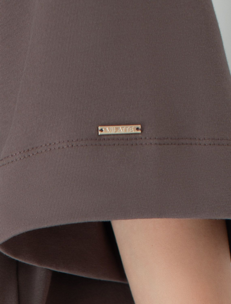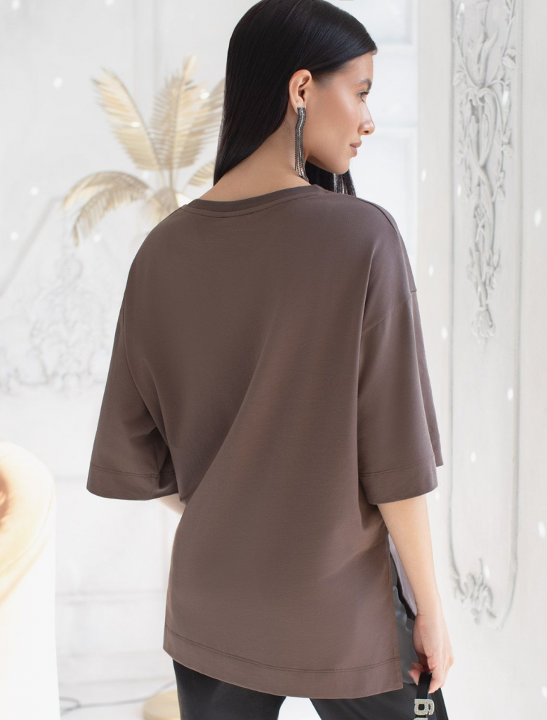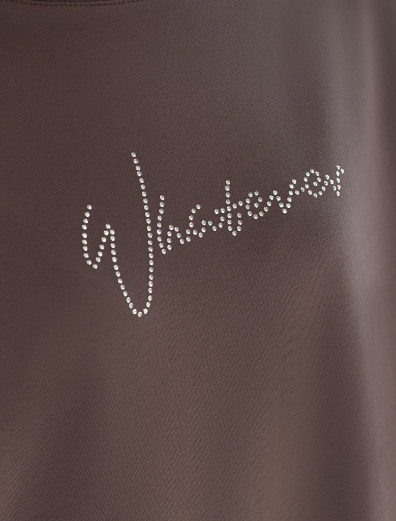 Оверсайз футболка кофейного цвета с из премиального хлопка с добавлением эластана создана для комфорта и стиля каждый день. Натуральный материал приятный к телу, дышащая ткань хорошо держит форму и подходит для повседневной носки дома, в офисе или на прогулке. Классический свободный крой, удлиненный прямой силуэт и свободная посадка делают эту базовую футболку универсальным решением для любой фигуры и роста, включая плюс сайз размеры и беременных девушек, отлично скроет животик. Широкие рукава держат форму и подойдут на полные руки. Нарядная футболка украшена авторским принтом в виде надписи блестящими стразами, которые создают красивый мерцающий эффект. Перевод надписи Whatever - Что бы ни... Такой акцент делает модель уместной как для особых случаев, так и для ежедневных образов. Такая эффектная длинная футболка станет универсальным дополнением гардероба, позволяя создавать разнообразные образы с акцентом на современный стиль и утонченность деталей. Благодаря стильному дизайну с боковыми разрезами эта фут