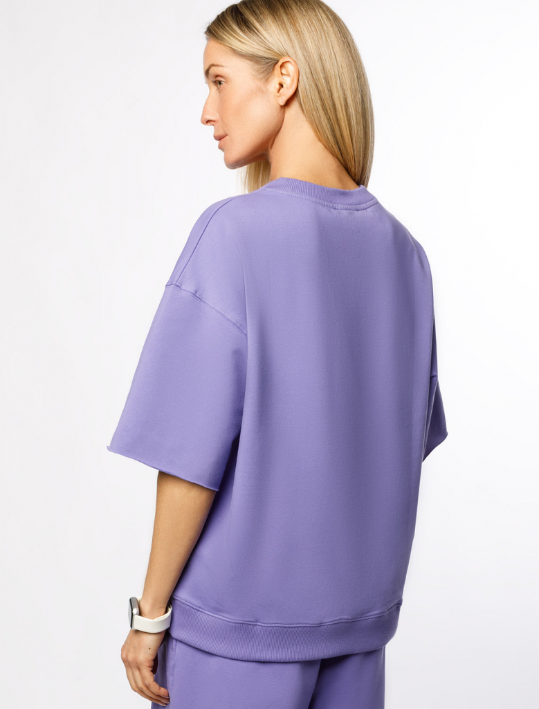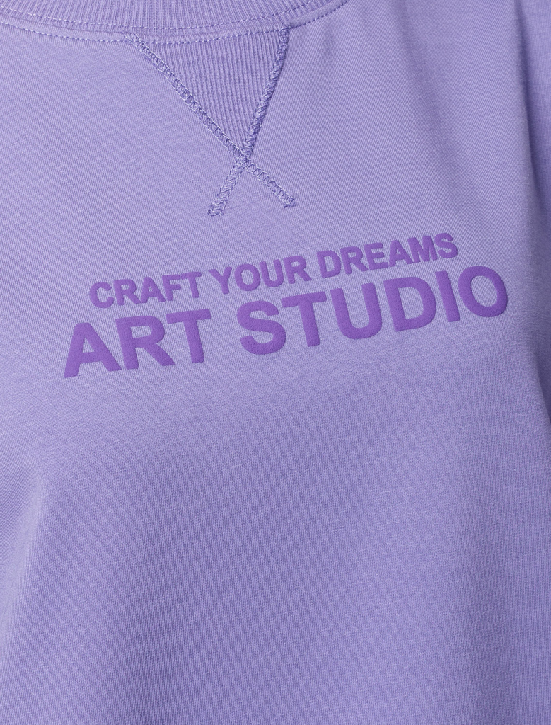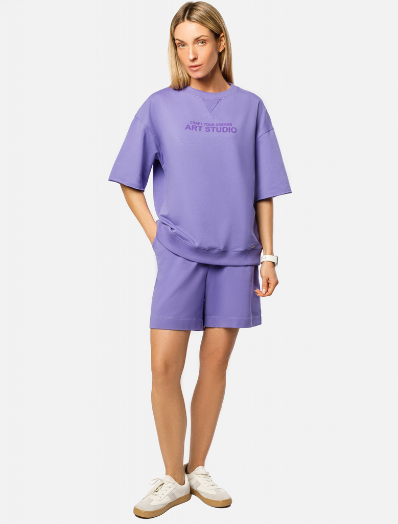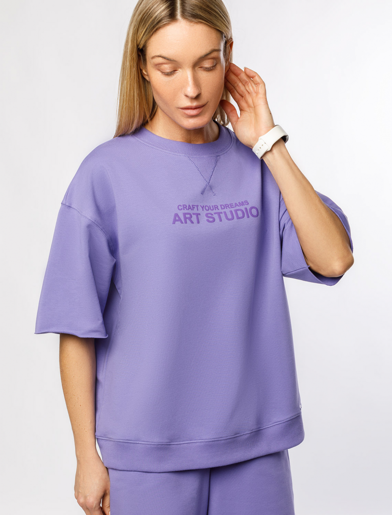 Перевод принта: Craft your dreams, art studio - стань скульптором своей мечты. Футболка свободного кроя со спущенным плечом выполнена из футера двухнитки с эластаном. Лаконичный принт нанесен фактурной краской. Эластичный материал гарантирует комфорт и формоустойчивость. Сочетается в костюме с брюками D44.138, D44.139 и шортами D48.008. Изделие дополнено металлическим логотипом бренда.