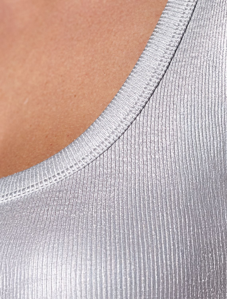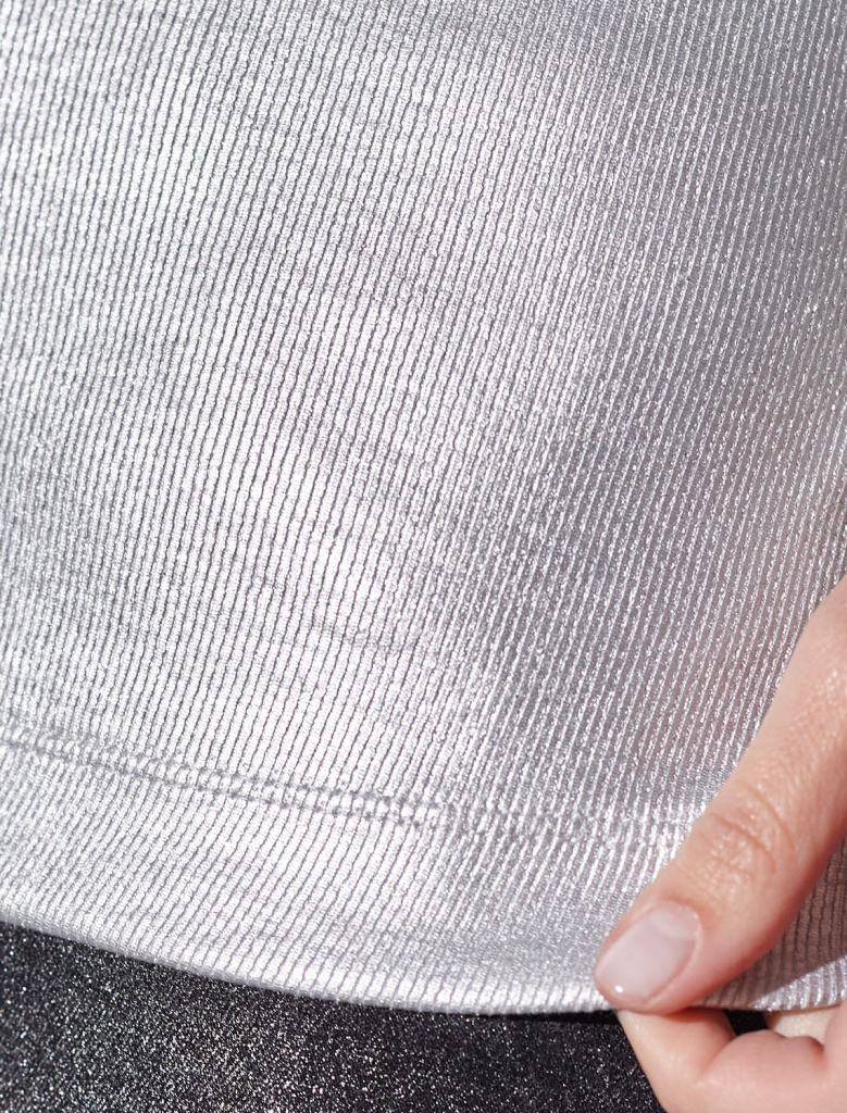 Стильная футболка серебристого цвета с U вырезом выполнена из премиального хлопка с добавлением эластана. Эффектное матовое покрытие металлик придает футболке изысканный блеск. Чуть удлиненные рукава и глубокий круглый вырез, открывающий область декольте, добавляют женственность и элегантность образу. Мелкий рубчик визуально вытягивает силуэт, за счет эластана в составе материал прекрасно тянется и садится на любую фигуру, в том числе большие размеры. Ткань износостойкая, сохраняет свой превоначальный вид даже после многочисленных стирок, отличается мягкостью и приятными тактильными ощущениями, такой материал не раздражает кожу, дарит ощущение уюта даже при длительном ношении, а воздухопроницаемость позволяет коже свободно дышать.Повседневная футболка универсальна: она сочетается с джинсами, юбками или строгими брюками — легко создать как деловой образ для офиса, так и наряд для вечеринки или ужина вне дома. Матовое покрытие создает благородный блеск без лишней яркости, благодаря чему футболка смотрится