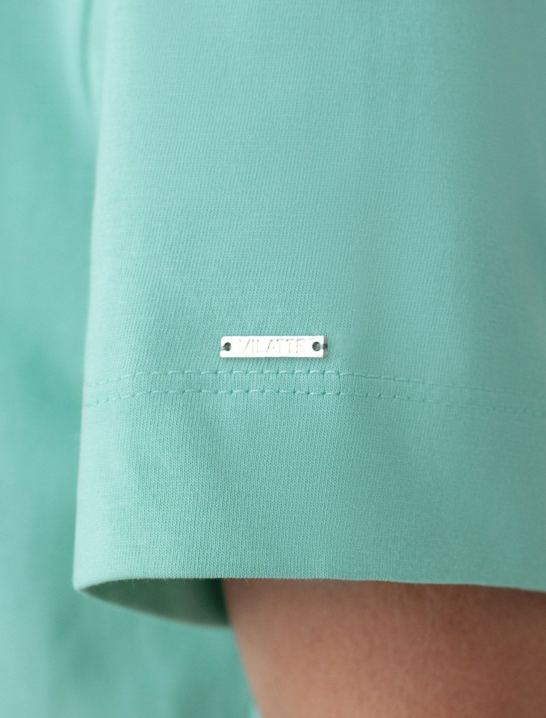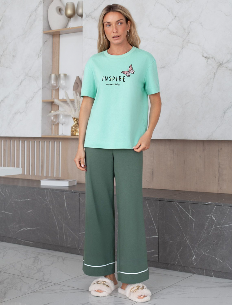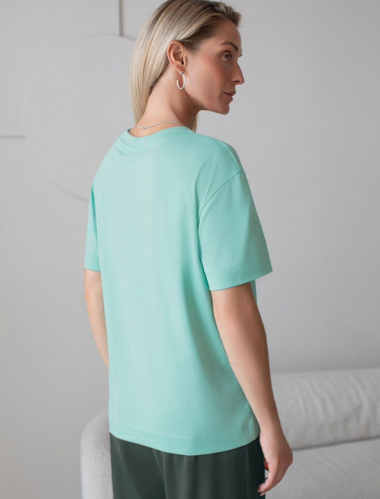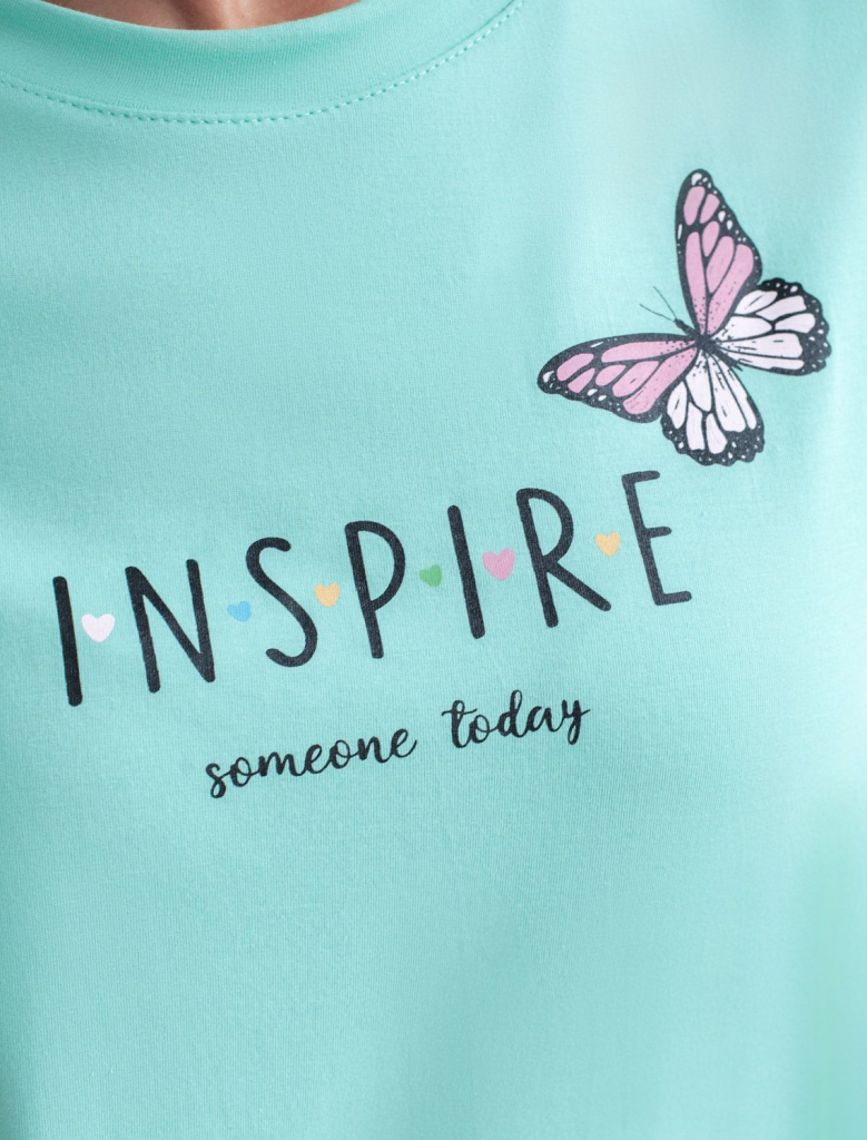 Футболка мятного цвета изготовлена из премиального хлопка с эластаном, она обеспечивает невероятное ощущение уюта и легкости. Натуральный материал сохраняет форму и цвет после множества стирок, обеспечивая долговечность изделия, а его высокая воздухопроницаемость создает ощущение свежести даже в течение долгого дня. Особое внимание привлекает стильный принт в виде бабочки с минималистичной надписью, перевод надписи Inspire Someone Today - Вдохновите кого-нибудь сегодня . Принт выполненны красками с устойчивым покрытием, который добавляет изделию оригинальности и позволяет выразить индивидуальность. Свободный крой футболки дарит удобство и не стесняет движений, что делает ее идеальной для повседневной носки или активного отдыха, подчеркивает современный взгляд на моду. На рукаве металлический логотип бренда. Подойдет девушкам и женщинам на любую фигуру, вы будете чувствовать себя в ней уверенно и комфортно. Отлично впишется в гардероб благодаря универсальному дизайну, который легко сочетать с джинсами, шор