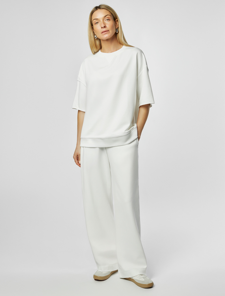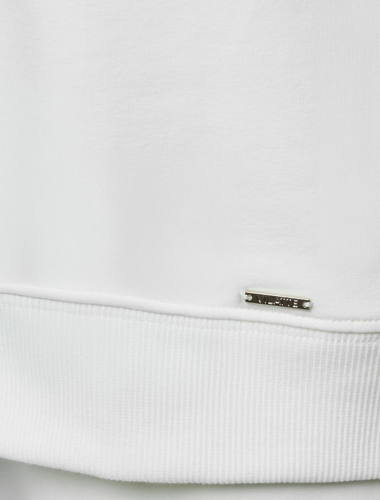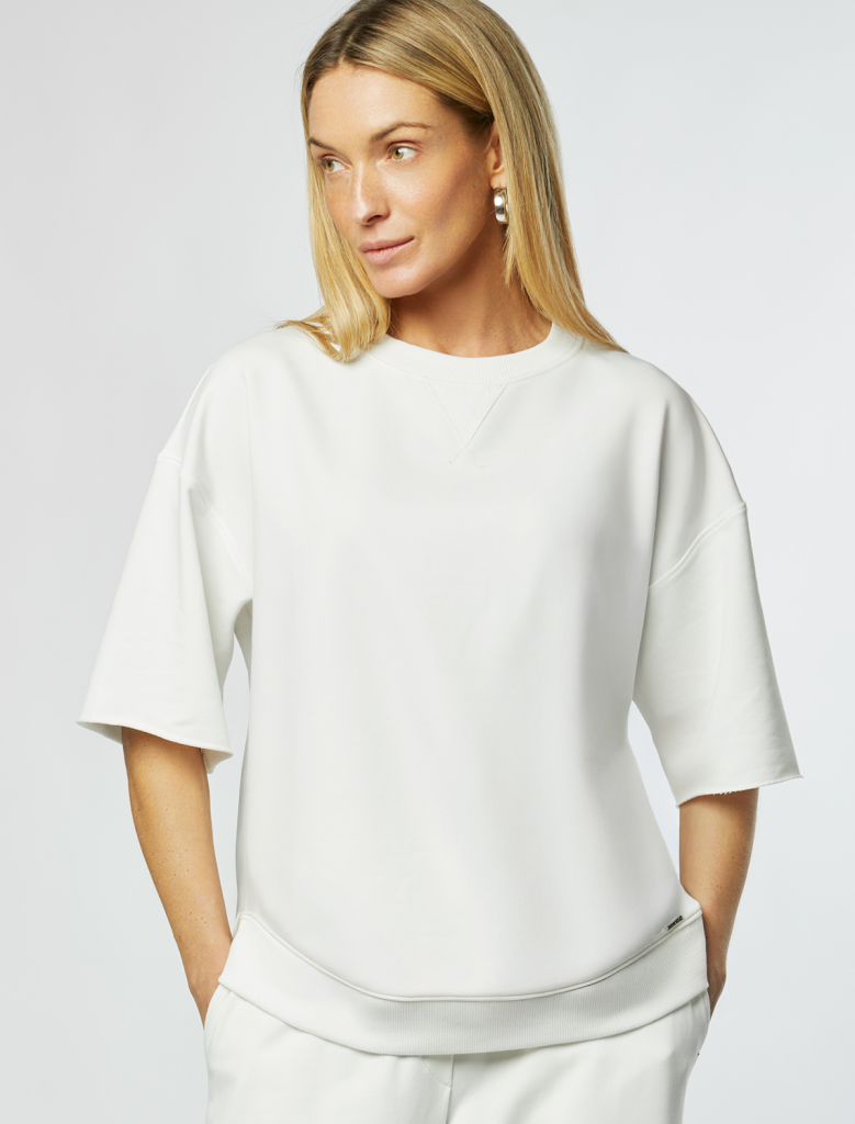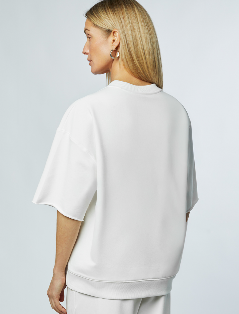 Футболка свободного кроя со спущенным плечом выполнена из футера двухнитки с эластаном. Лаконичный принт нанесен фактурной краской. Эластичный материал гарантирует комфорт и формоустойчивость. Сочетается в костюме с брюками D44.138, D44.139 и шортами D48.008. Изделие дополнено металлическим логотипом бренда.